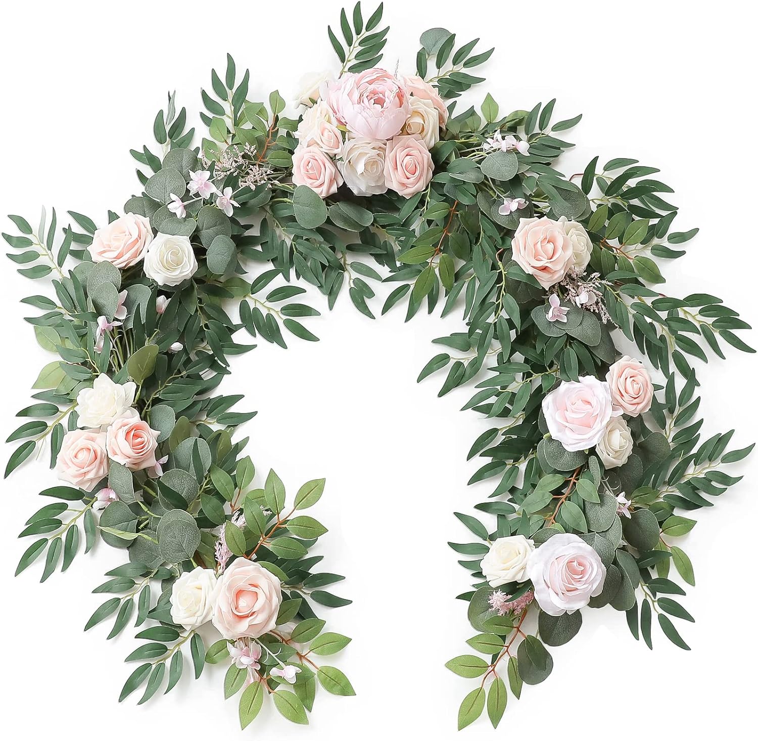 Floroom 6ft Artificial Eucalyptus Garland with Flowers Fake Greenery Faux Floral Vine Garland for Table Decor Wedding Centerpieces Bridal Shower Party Decorations, Blush & Cream