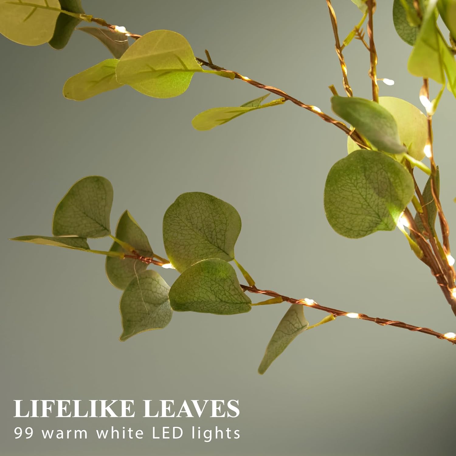 - 🎄 【Variable Shape】The lighted eucalyptus branches are 33 inches tall and contain 99 warm white LED lights. The flexible and sturdy branches of these eucalyptus lights make it easy to shape it the way you want (if the leaves fall off while shaping, you can easily put them back on), and you can also put some Christmas, Easter, or other holiday decorations on the lighted branches to decorate it.