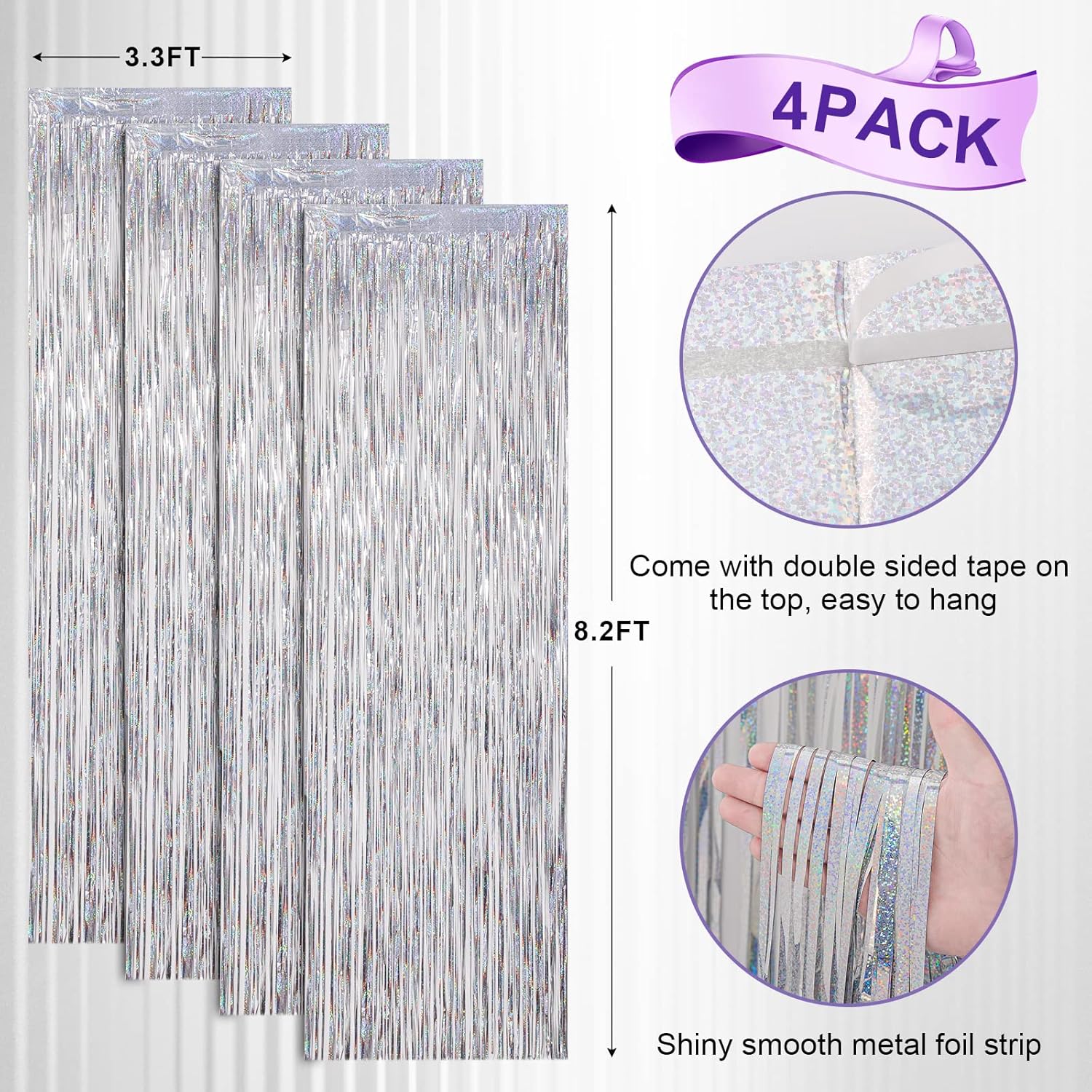 4 Pack Laser Silver Foil Fringe Backdrop Curtains, Tinsel Streamers Birthday Party Decorations, Fringe Backdrop for Graduation, Baby Shower, Gender Reveal, Disco Party