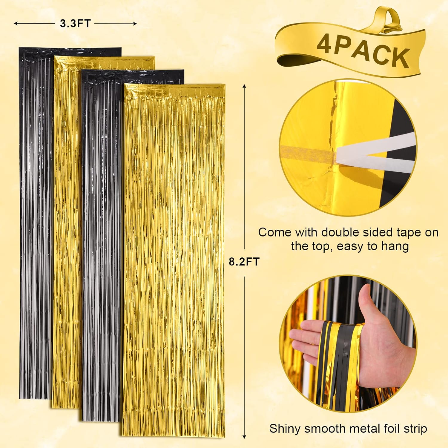 4 Pack Black and Gold Foil Fringe Backdrop Curtains, Tinsel Streamers Birthday Party Decorations, Fringe Backdrop for Graduation, Baby Shower, Gender Reveal, Disco Party