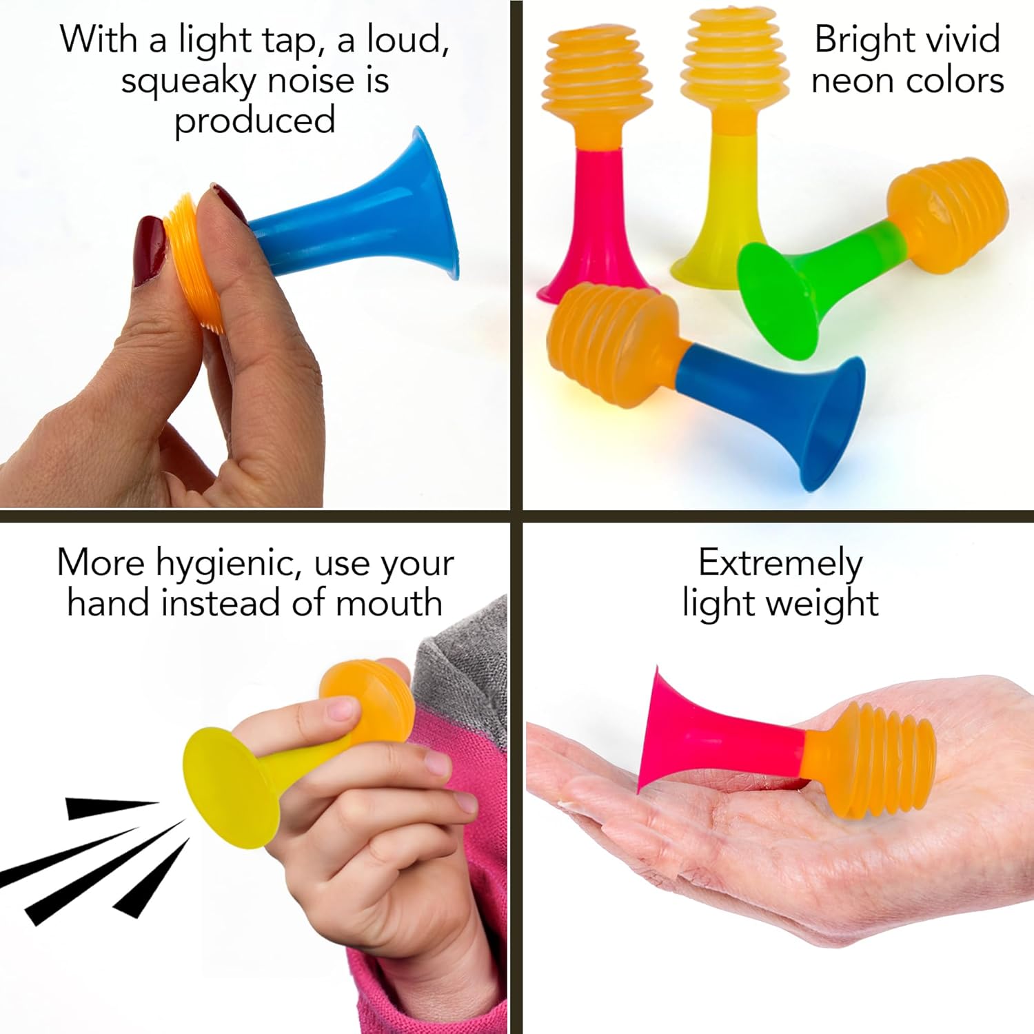 - MADE FOR SHARING: Since you won’t have to use your mouth, you can easily pass these noise making toys around the group. High-quality plastic trumpet also adds a serving of durability to keep up with all the enthusiasm.