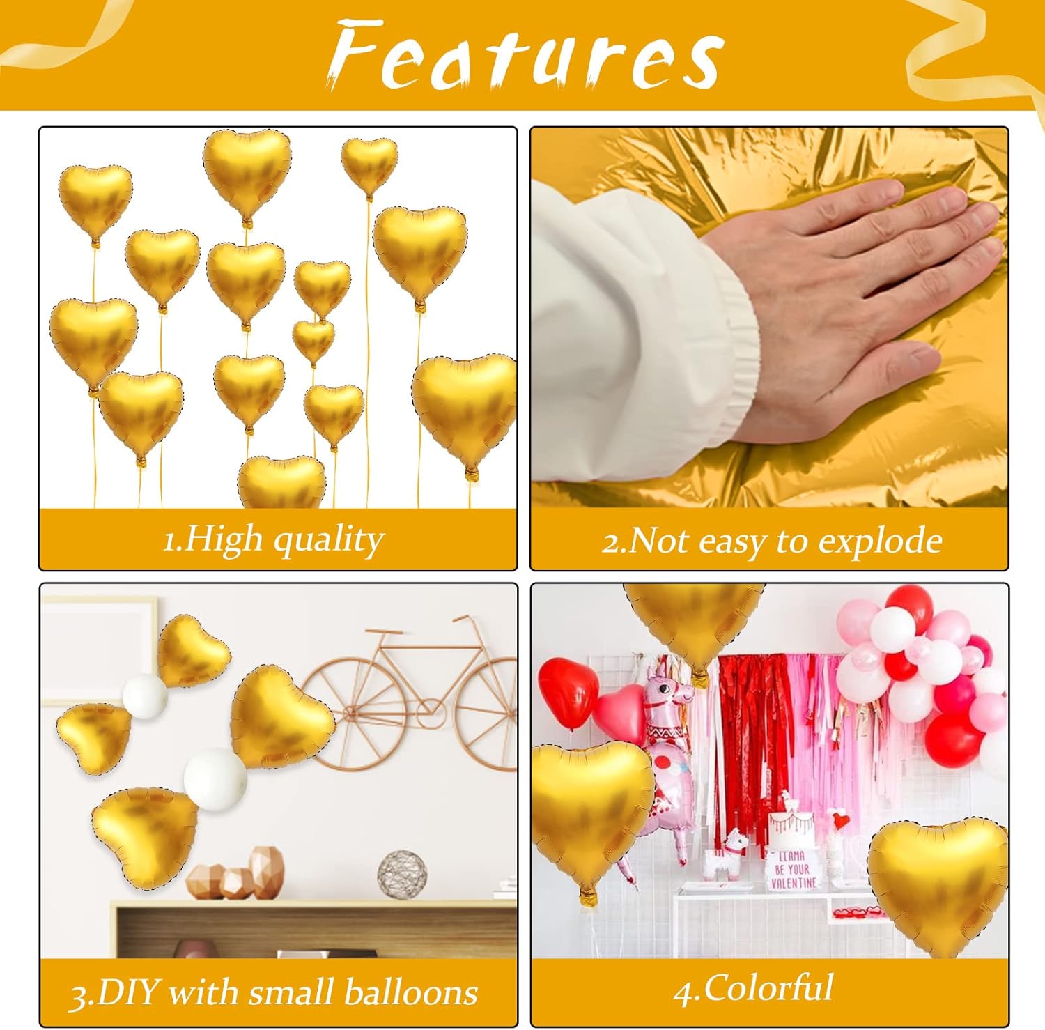 - 💖 10 PCS GOLD FOIL HEART BALLOONS: Package contains 10 x 18 inch gold heart balloons, 1 x 10m ribbon.The gold heart shape balloons are specially shaped, the perfect size for your holiday or party decorating needs, together create a fun and surprising party, leave an unforgettable smile!