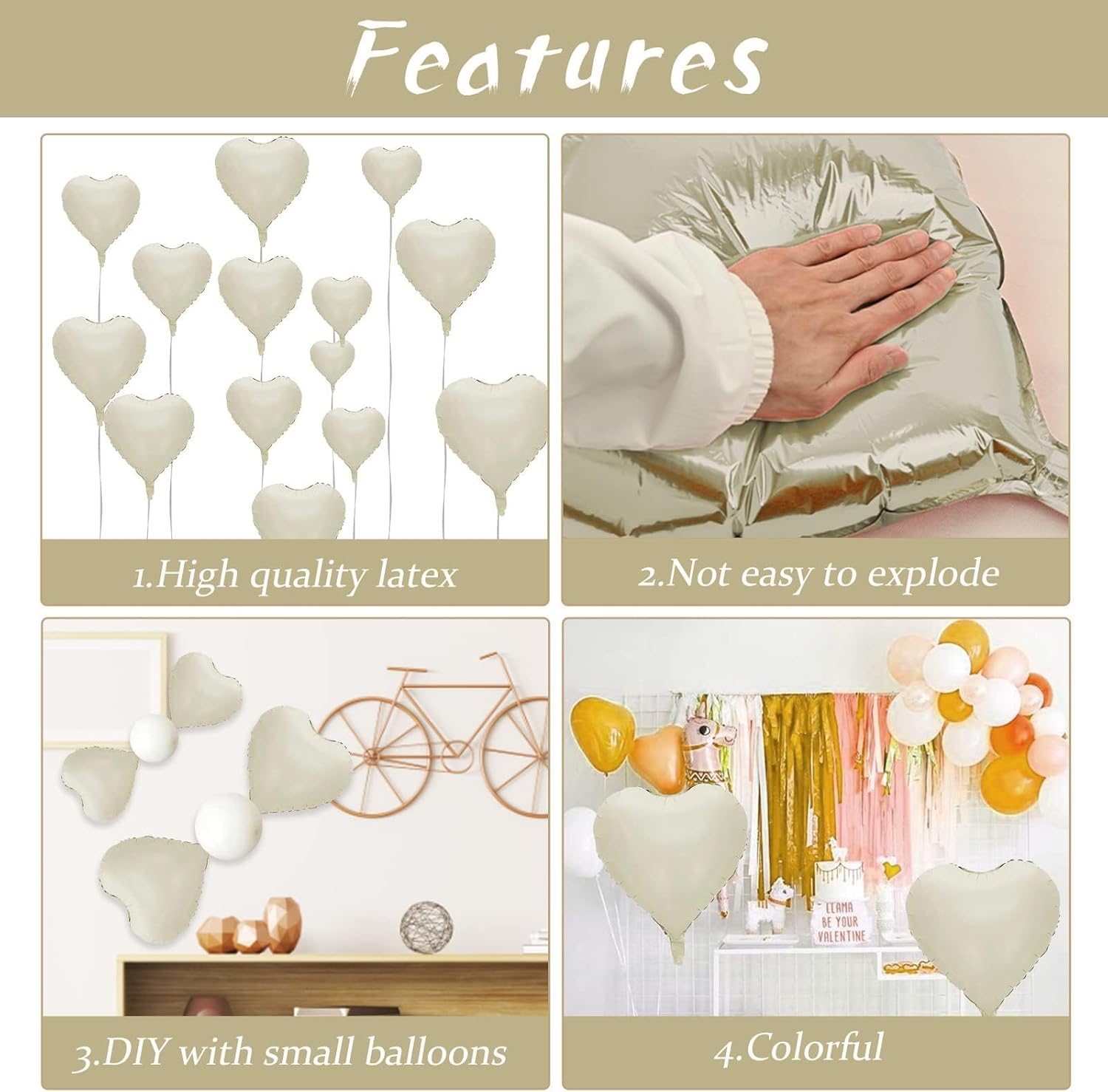 - 💖 High Quality Materials: Our beige white heart balloons are made of high-quality, safety foil, which makes them durable, glossy, and beautiful in shape. They feature a metal matte surface that adds a touch of elegance and class to any event. These foil heart-shaped balloons will create an exclusive sweet atmosphere for your party.