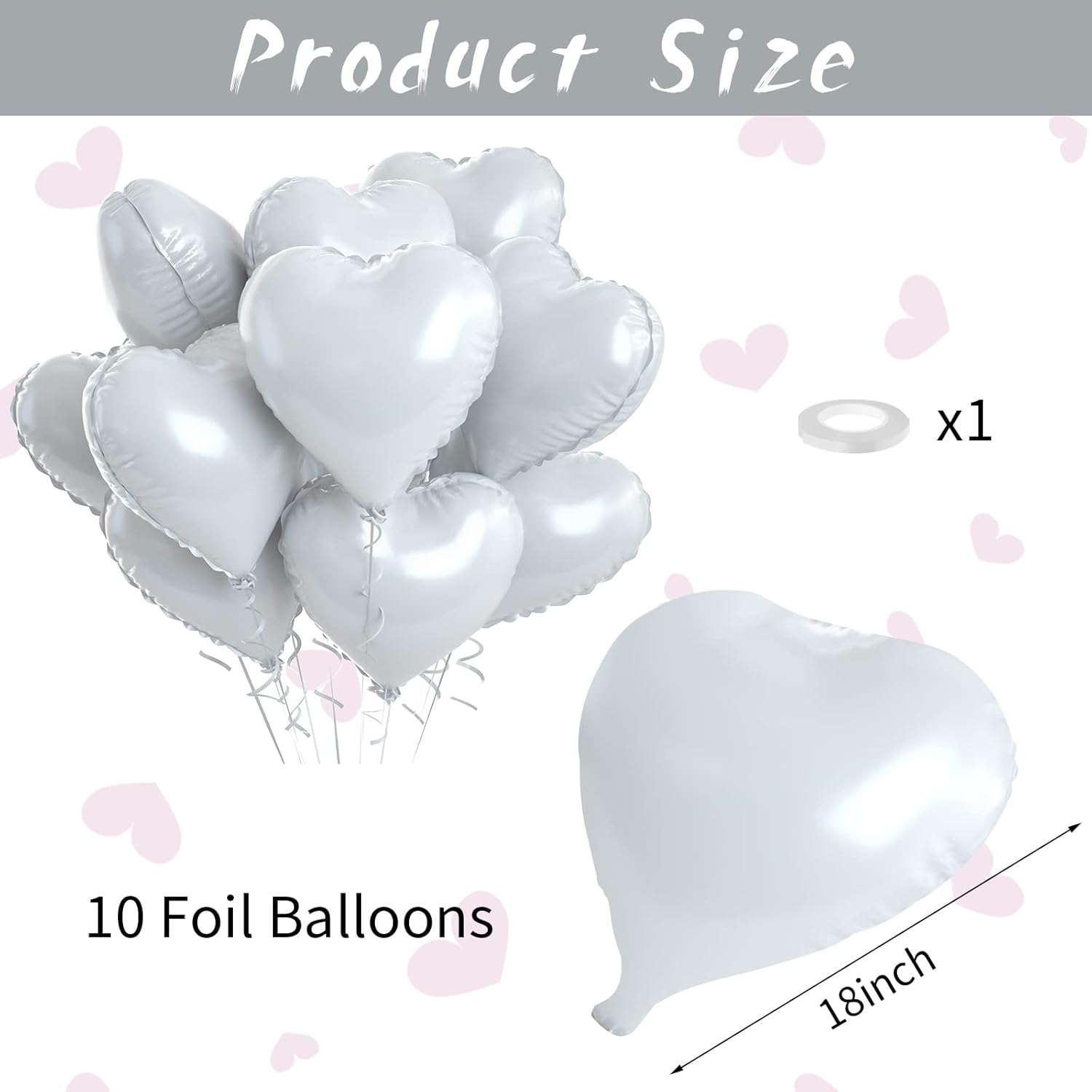 - 💖 10 PCS White Heart Balloons: Our package contains 10 x 18 inches white heart shaped balloons, 1 x 10m ribbon. The white foil heart balloons are specially designed to add a touch of fun and surprise to any party or holiday celebration. With a size of 18 inches, they are the perfect addition to your decorating needs, leaving your guests with an unforgettable smile!