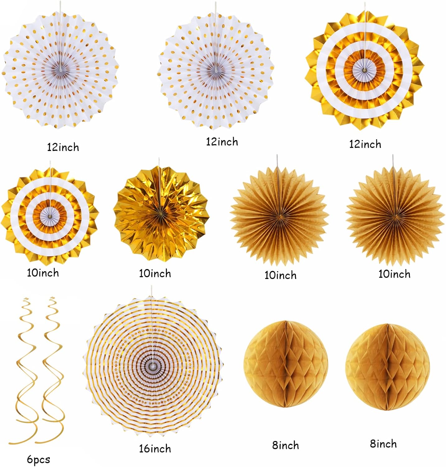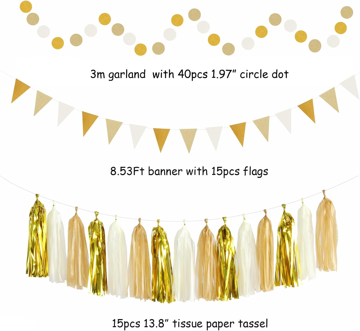 - Package Including:The white gold party decorations 1pcs paper garland dots,1pcs Triangle Flags in ivory gold champagne,15pcs tassel garland,2pcs 8” honeycomb ball,6pcs gold streamers swirl,4pcs 10” paper lantern fan in three color,3pcs 12”paper lantern fan in three color,1pcs 16”paper lantern fan.