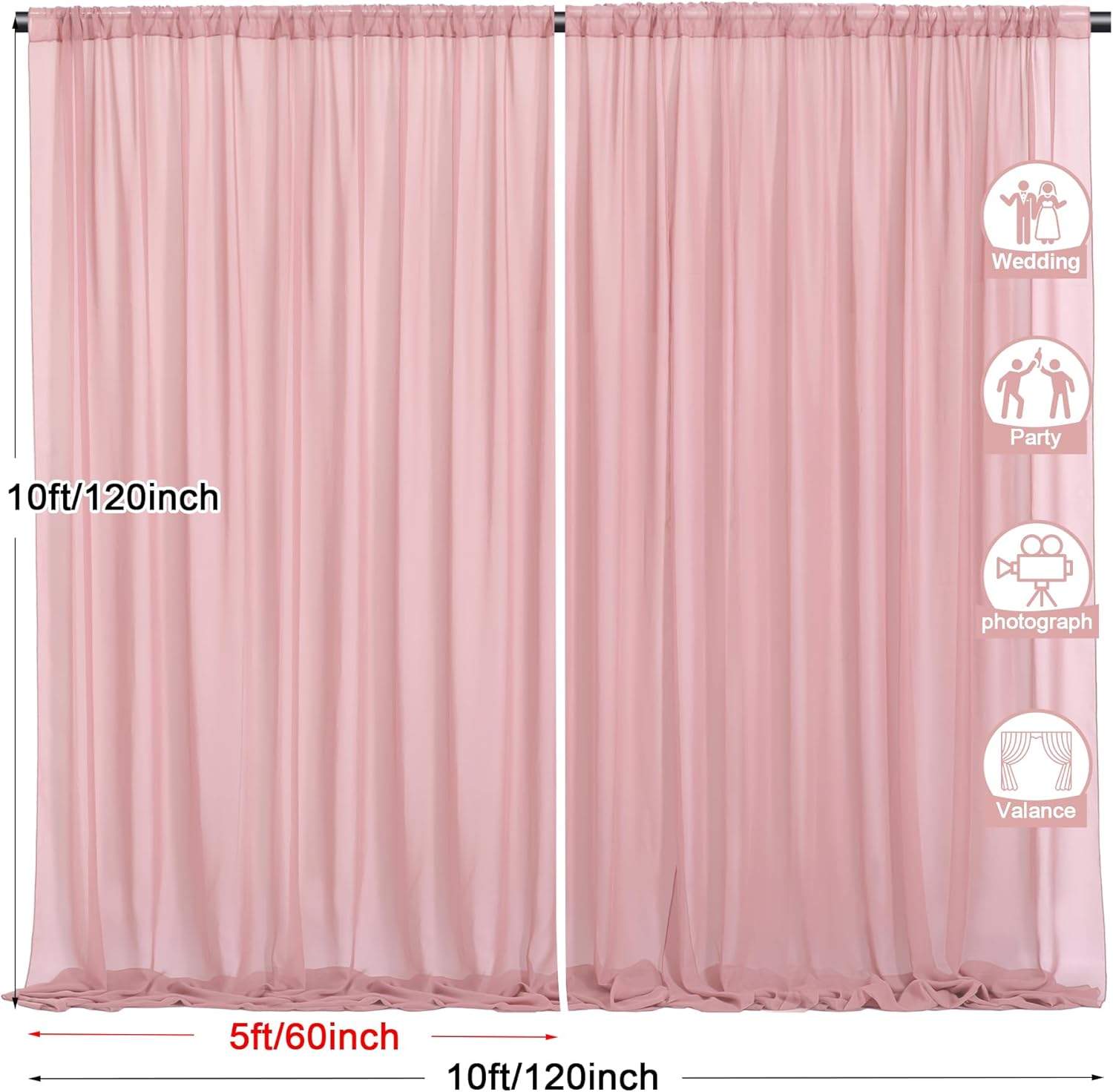 - 2 Panels Backdrop Drapes: Come with 2 panels Dusty Rose chiffon backdrop curtains,each panels size is 5ft width and 10ft height. Combined, entire backdrop curtains is 10ft*10ft. Please note: Not including the background stand