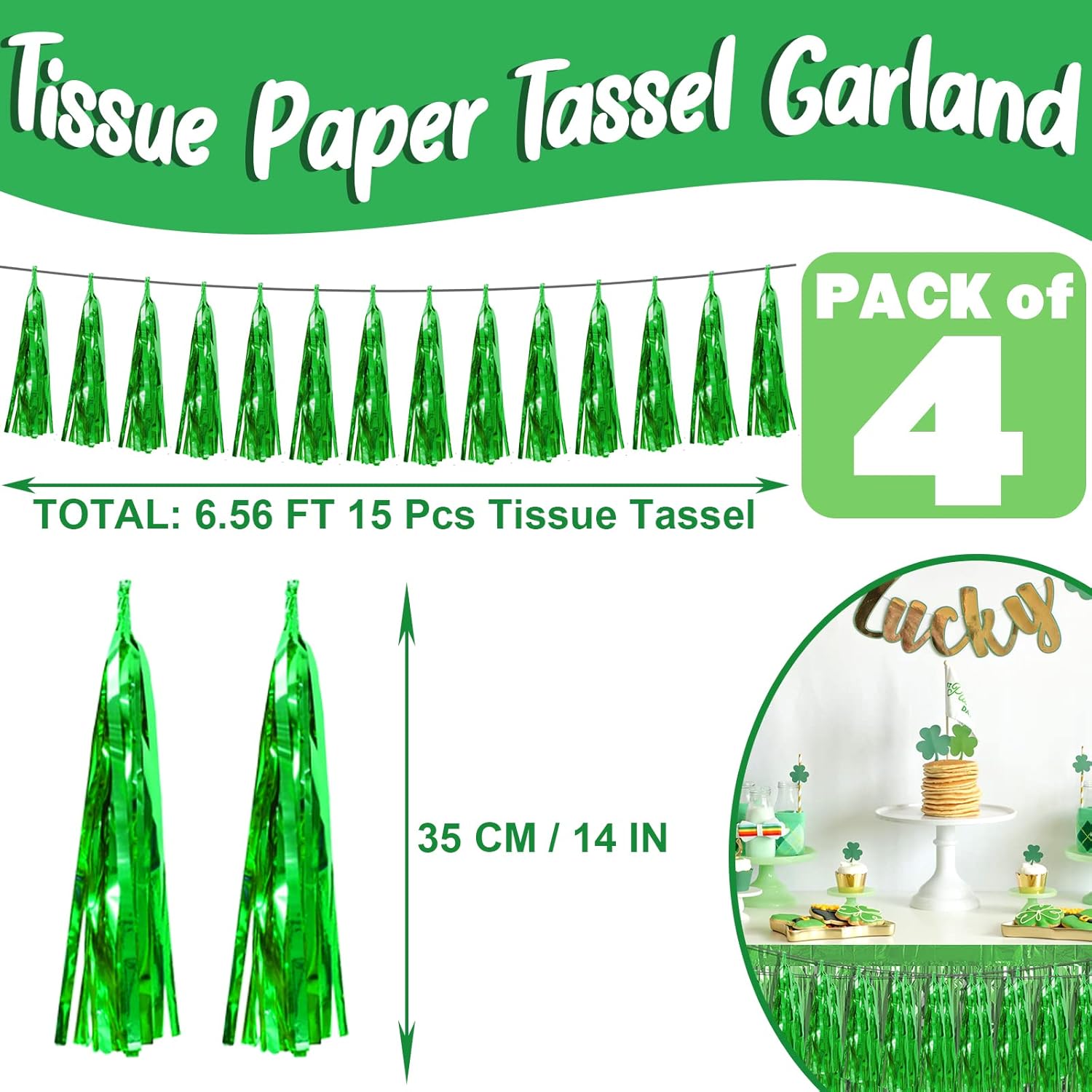 - 【Green Party Supplies Set】: The total length of the green birthday tassels banner is 26.2 feet, divided into 4 strips, each 6.5 feet long. Each banner contains 15 tassels, and each tassel measures 14 inches, for birthday decorations many occasions, and so on