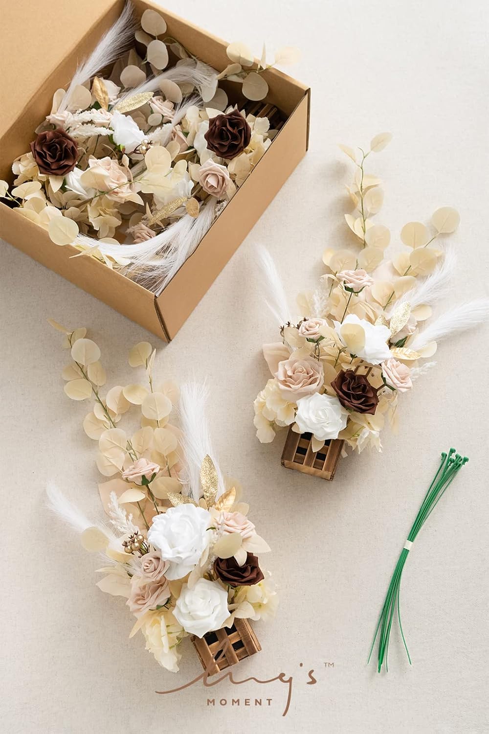 - NEVER WILT: Our flowers are made of high-quality silk/foam flowers and plastic greenery. Including white silk Vendela rose, white/nude foam rose, white/walnut brown avalanche rose, nude high-centered rose, and some beige, golden fake leaves, pampas grass, golden eucalyptus. These artificial materials ensure that the flowers will remain beautiful and vibrant for an extended period of time.