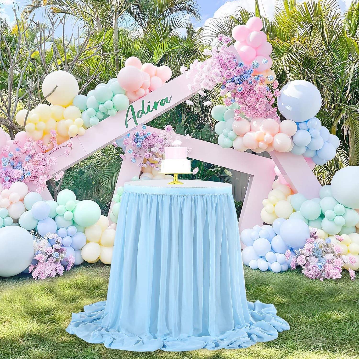 - 💡 Baby Blue Table Skirt Material: The extra long chiffon table skirt is made of Sheer Chiffon which is wrinkle-free, soft, and with a nice drapery. Table skirt both robust for kids birthday party supplies and elegant if used for wedding decoration.