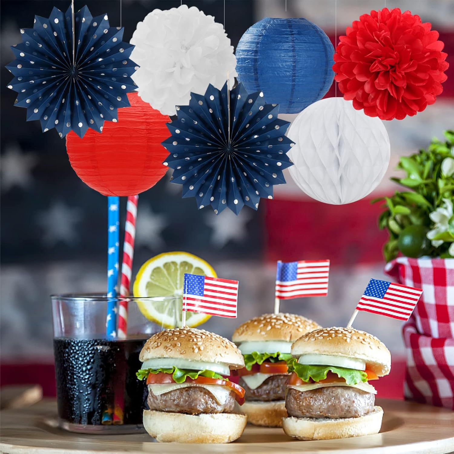 Fourth-4th of July-Imemorial Party-Decorations Lanterns - 14pcs Red White Blue Graduation Paper Streamers Fan,Tissue Pom Poms Streamer,Honeycomb Balls,USA Patriotic America Independence Decor Ouruola