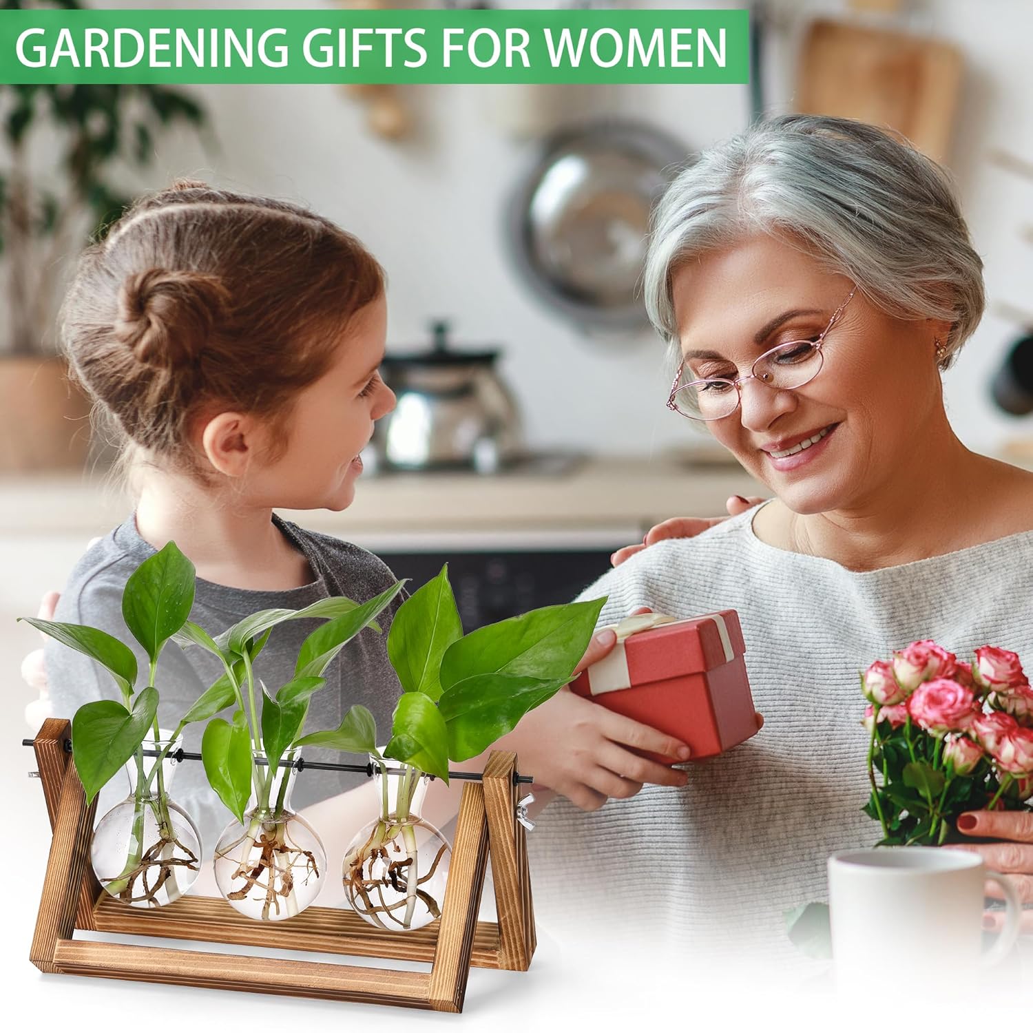 YIBOT Plants Propagation Stations,Desk Plant Terrarium with Retro Wooden Stand,Plant Lover Gifts for Women for Hydroponics Plants Home Garden Wedding Decor(3 Bulb Vase)