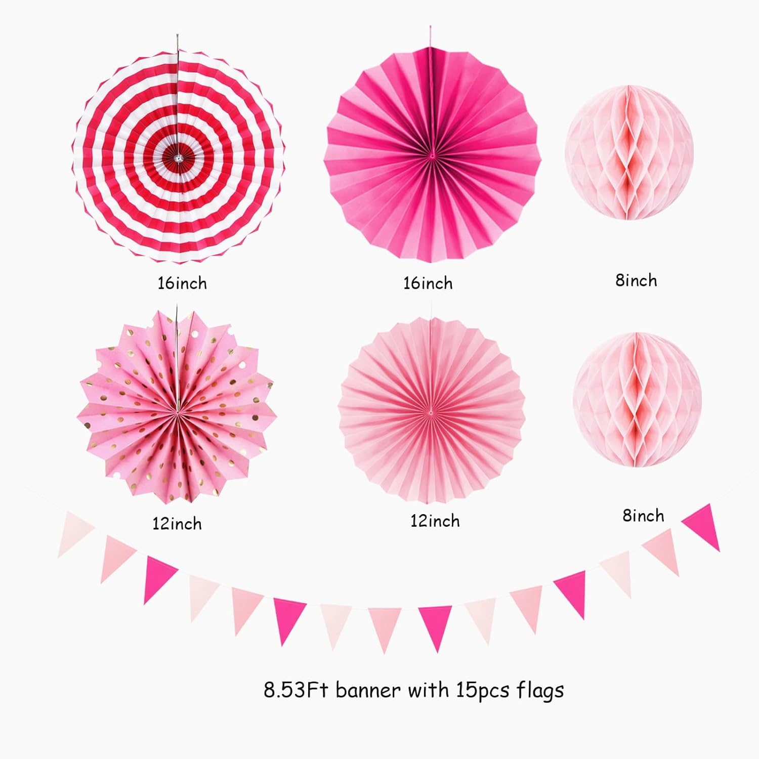 - [Package Includes] Rose hot pink party decorations kit contains: 1 x triangle bunting, 4 x paper fans, 9 x tissue pom poms, 2 x honeycomb balls, 4 x paper lanterns, a total of 20 pieces of various sizes of decorations. Better embellish your party.
