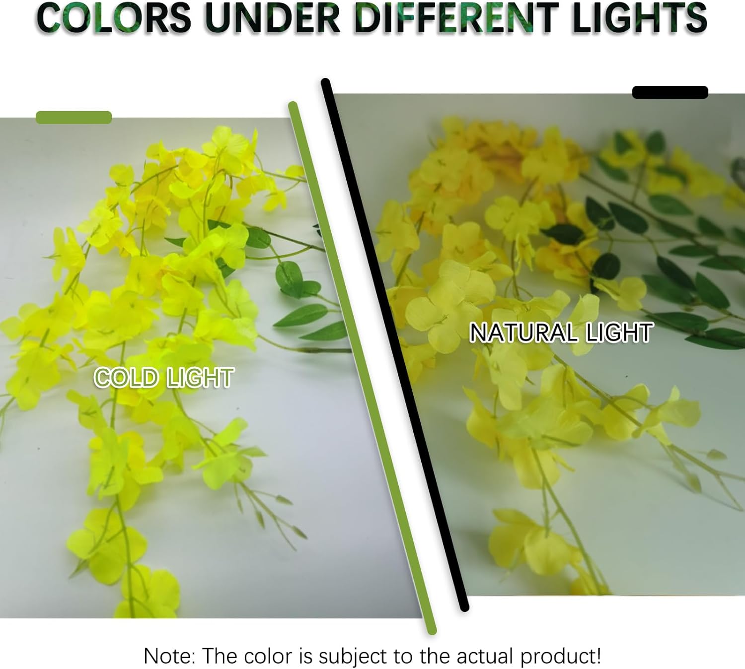 - 【Exquisite and Reliable Silk Material】This faux flower vines string is made of silk, the delicate yellow wisteria flowers garland is supported by plastic rods inside, they are colorful, reliable, and do not fade easily; They are easy to wash and keep clean, and the shape is realistic, looks natural and does not fall off the rods easily.