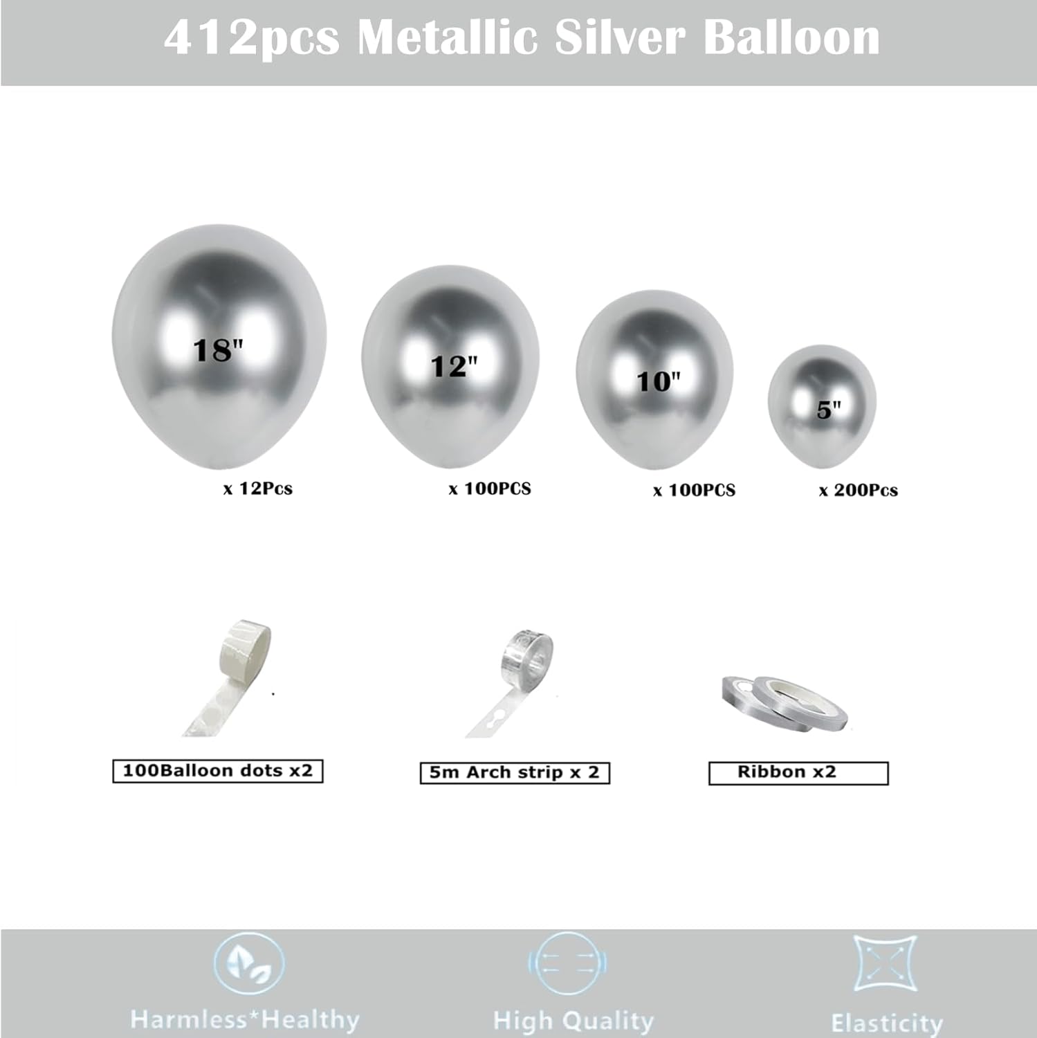 - METALLIC SILVER BALLOON ARCH GARLAND KIT: Includes 412 Metallic silver Balloons, 18inch 12pcs, 12inch 100pcs, 10inch 100pcs, 5inch 200pcs , 2 rolls of Balloon glue point(200pcs), 2 rolls of balloon decoration strip(32.8 feet / 5m*2 with 220 holes), 2 roll of ribbon. plenty in quantity, perfect for making indoor or outdoor them decoration.