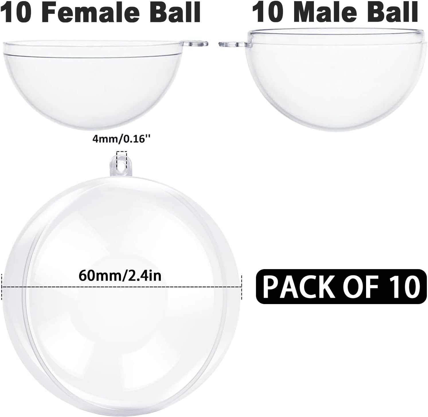 - PACK OF 10: Super value bulk of 10 sets clear plastic ornaments balls, come with total of 20 hemispheres, 10 female and 10 male, simple assembly to get 10 complete spheres balls. Our clear plastic ornaments is round ball globe shape, 60mm in outer diameter. Perfect size, not too big, and not too small.