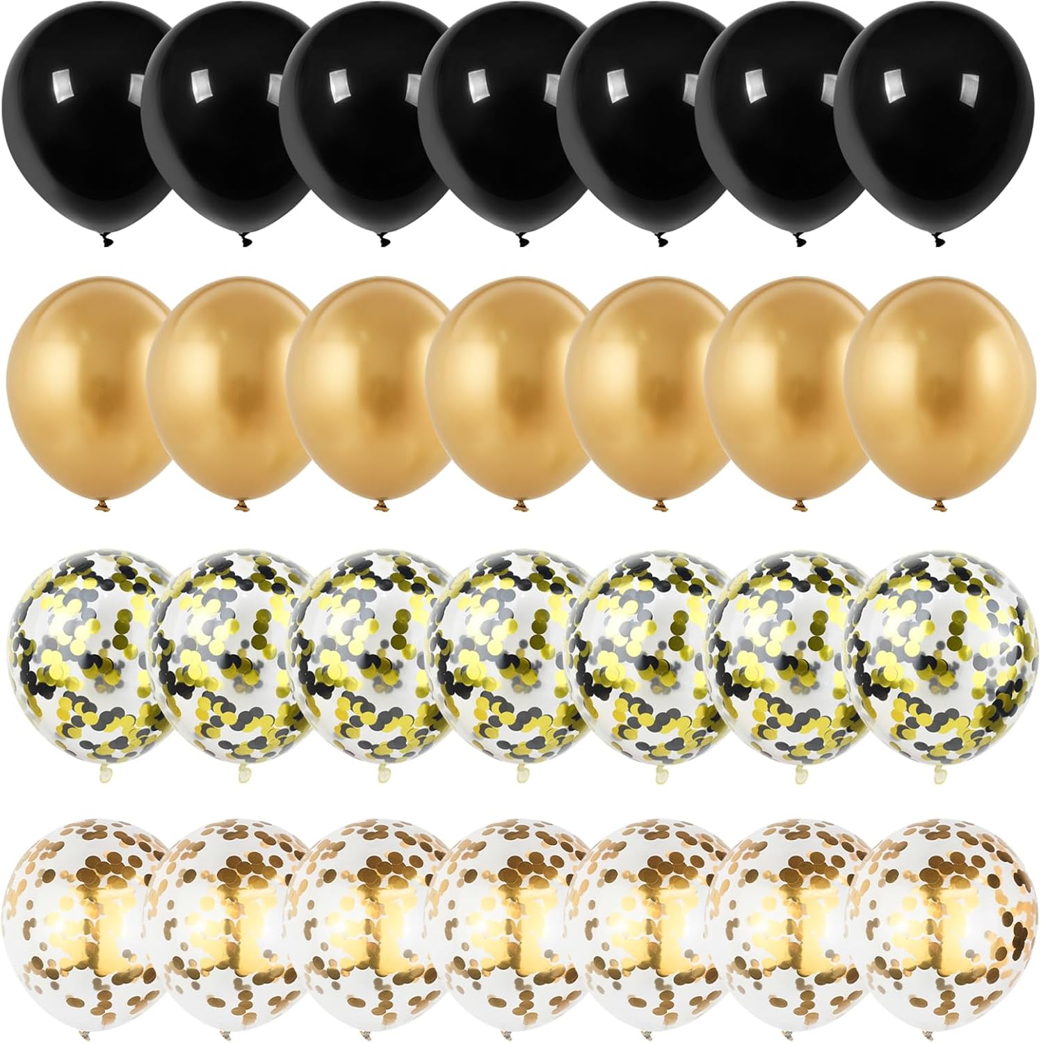 - 🎉 Black Gold Balloons - You will get 35 pieces 12 inch latex party balloons set, includes matte black 15pcs, metallic gold 12pcs, gold confetti 4pcs, black gold confetti 4pcs, come with 1pc gold balloon ribbon. Perfect for women men birthday baby bridal shower wedding new year party decorations supplies.
