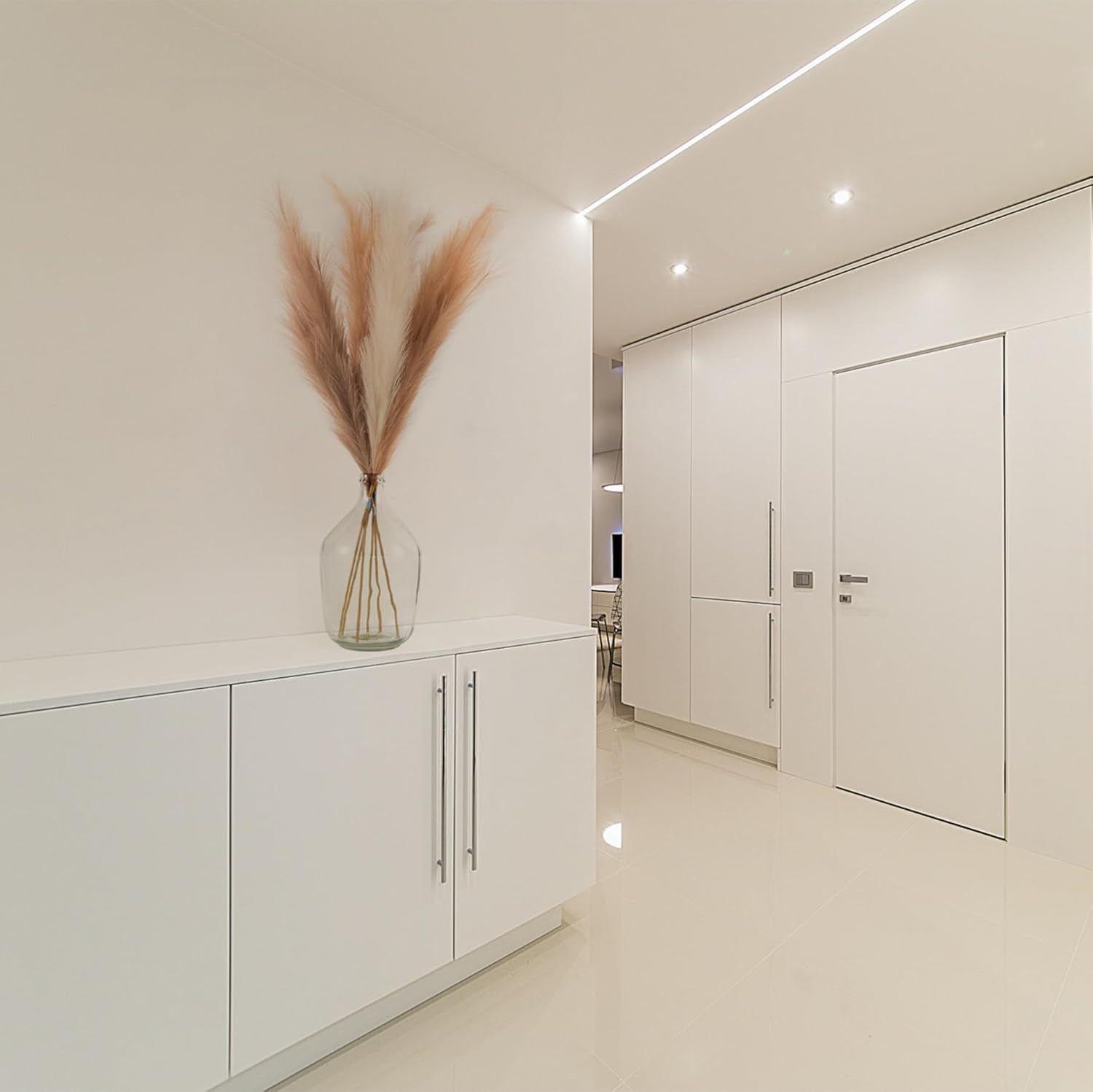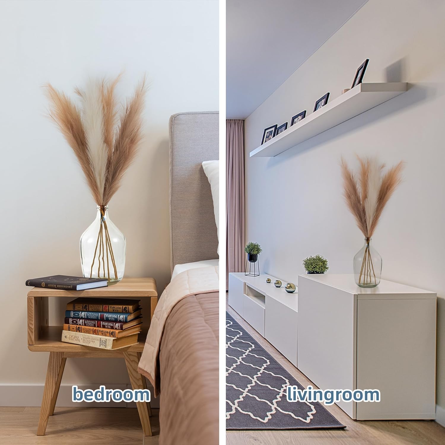 - Minimalistic&Elegant Pampas Grass Decor: Really nice faux pampas grass for home decor, display in your hallway, kitchen, living room, bedroom, front room, dining room, or entryway... any space. Pampas grass are also a great addition to weddings, flower arrangements, lifestyle photography, party, bohemian decorating and etc