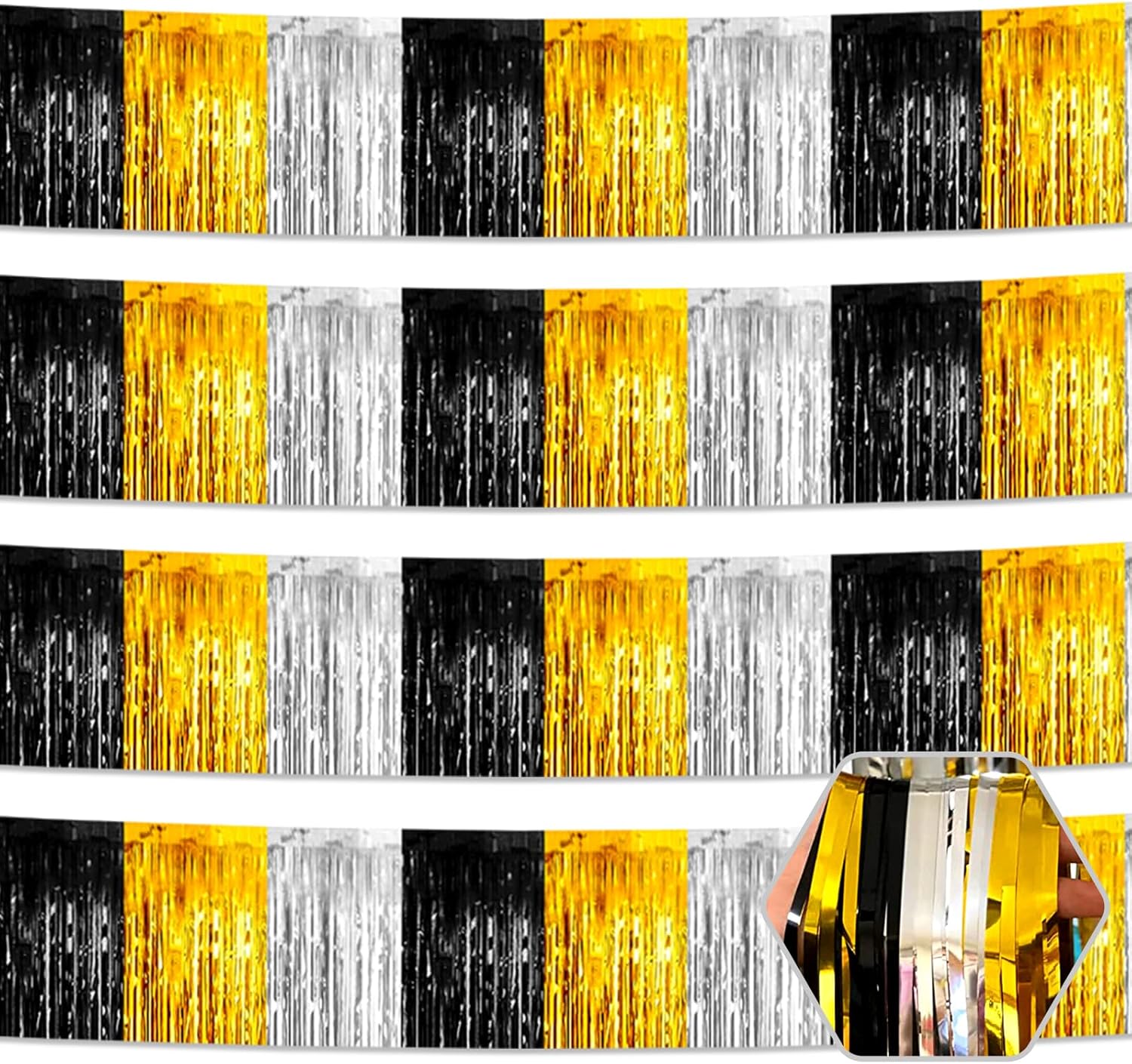 4 Pack 10 Feet Black Gold Silver Foil Fringe Garland Metallic Tinsel Streamers Banner Wall Hanging Curtain Backdrop for Parade Floats, Wedding, Graduate, Mother's Day, Birthday Party Decoration