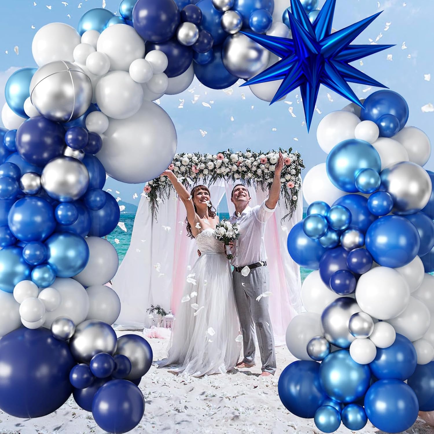 - 🎈What You Get - Blue Silver White Balloon Garland Arch Kit, package including 1pc blue explosion star foil balloon, 1pc 10 inches silver 4D round foil balloon, 2pcs 18 inches balloons(white*1, retro navy blue*1), 48pcs 10 inches balloons(pearl dark blue*20, matte white*10, metallic blue*6, retro navy blue*6, metallic silver*6), 40pcs 5 inches balloons(pearl dark blue*8, matte white*8, metallic blue*8, retro navy blue*8, metallic silver*8), 1pc balloon strip, 1pc dot glue. All in one package!
