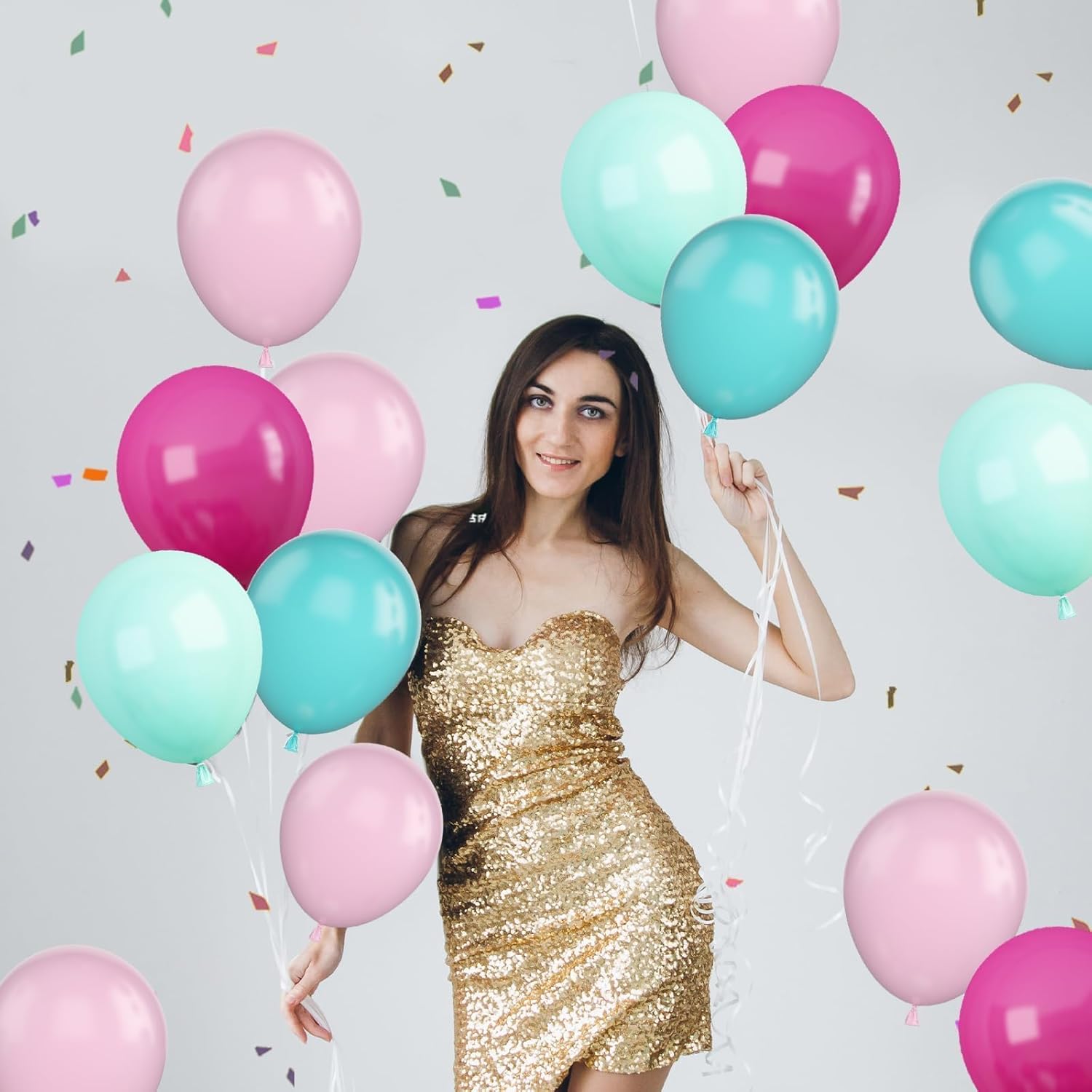 - Package Included : Our hot pink and teal blue birthday balloons set includes 60 pcs 12 inch latex balloons. 15 pcs hot pink balloons, 15 pcs pastel teal blue balloons, 15 pcs macaron pink balloons, 15 pcs teal blue balloons and 2 pcs hot pink ribbons