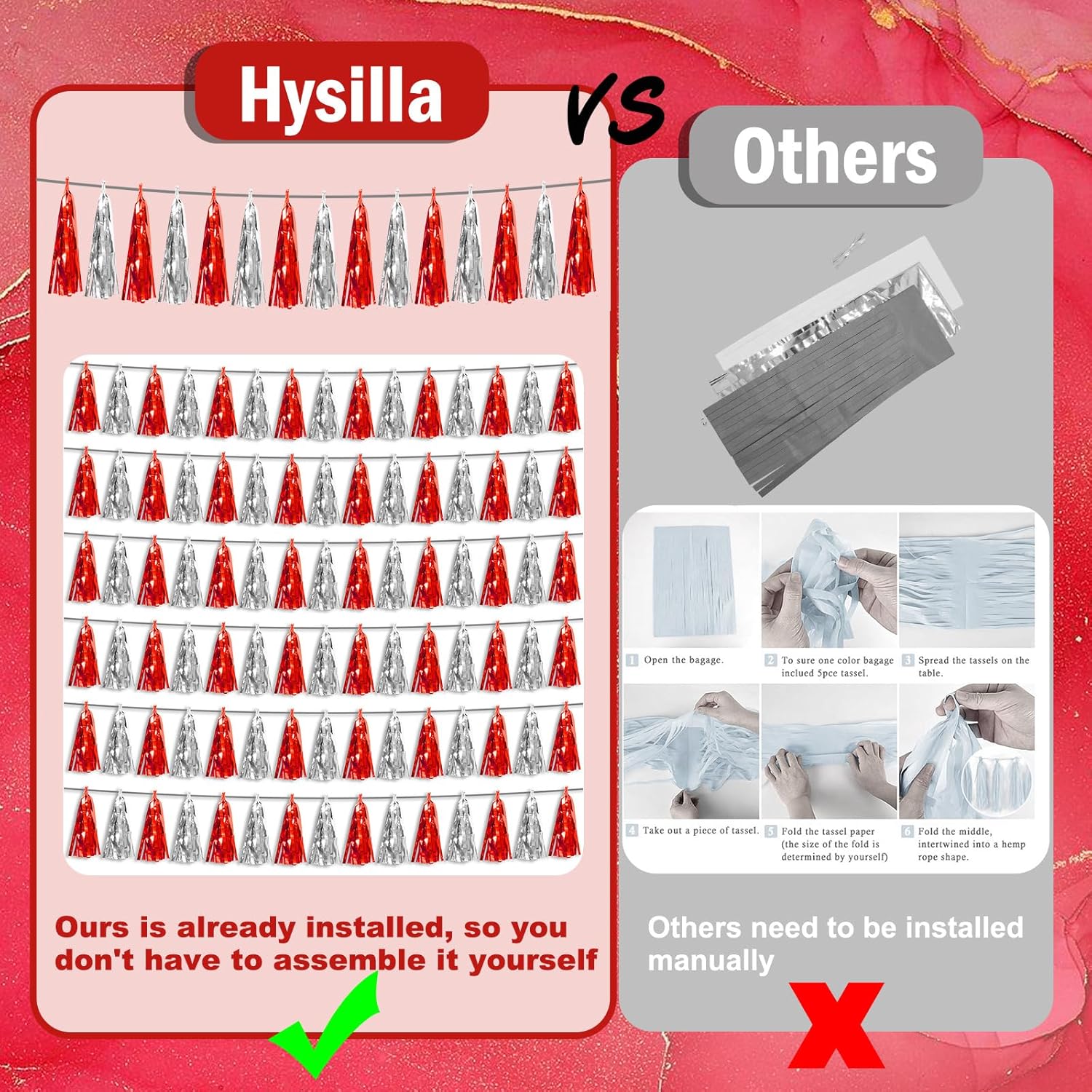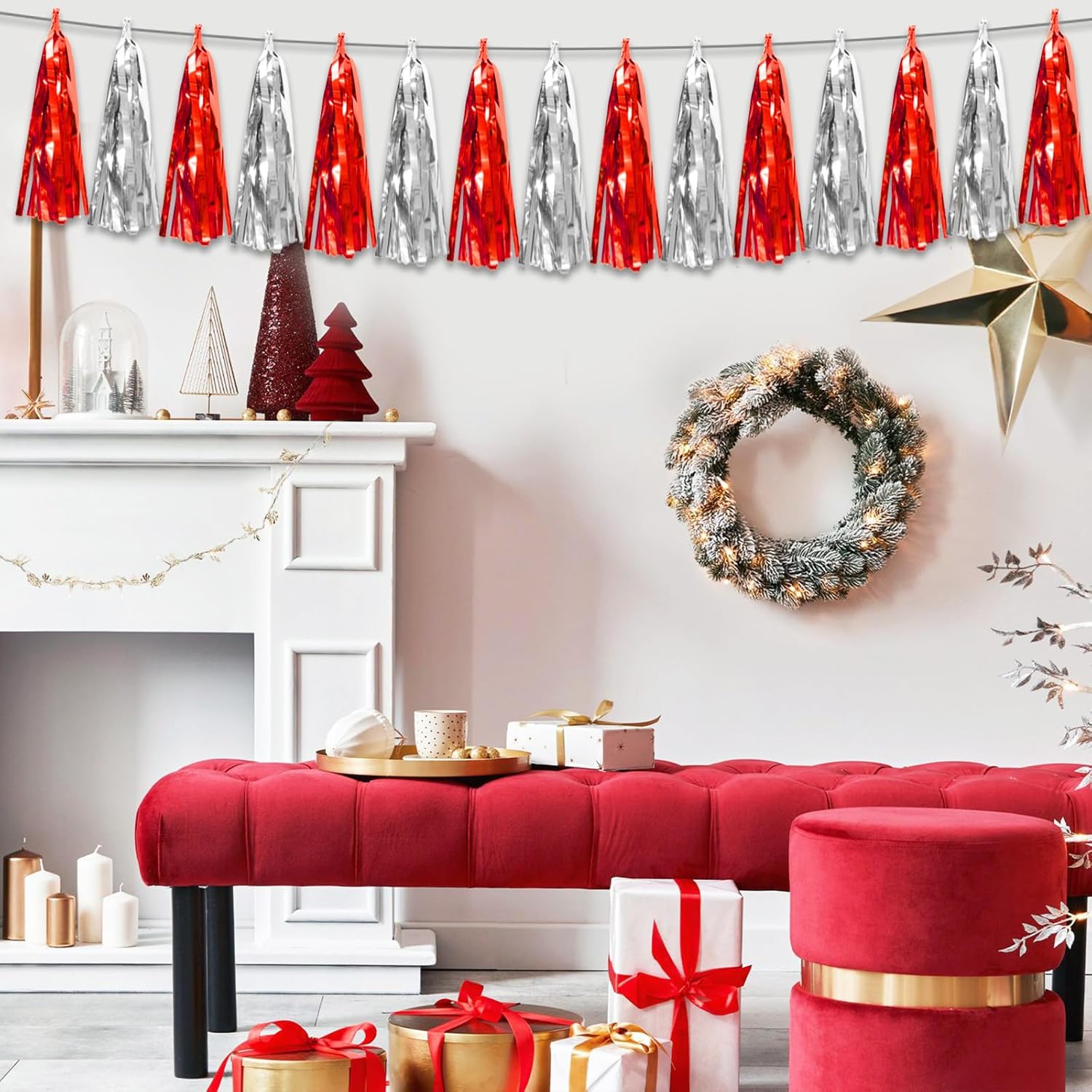 - 【Perfect Party Decoration】The Red Silver tinsel garlands are designed in a metallic Fringe, bright, and beautiful, at the same time, they shine in the sun, and these gorgeous tassel garlands create a wonderful backdrop or centerpiece for your party space. and bring you, your family, and your friend's good Visual effects. your party many emotional and touching moments where a lot of pictures will be taken and everybody will have a wonderful time together.