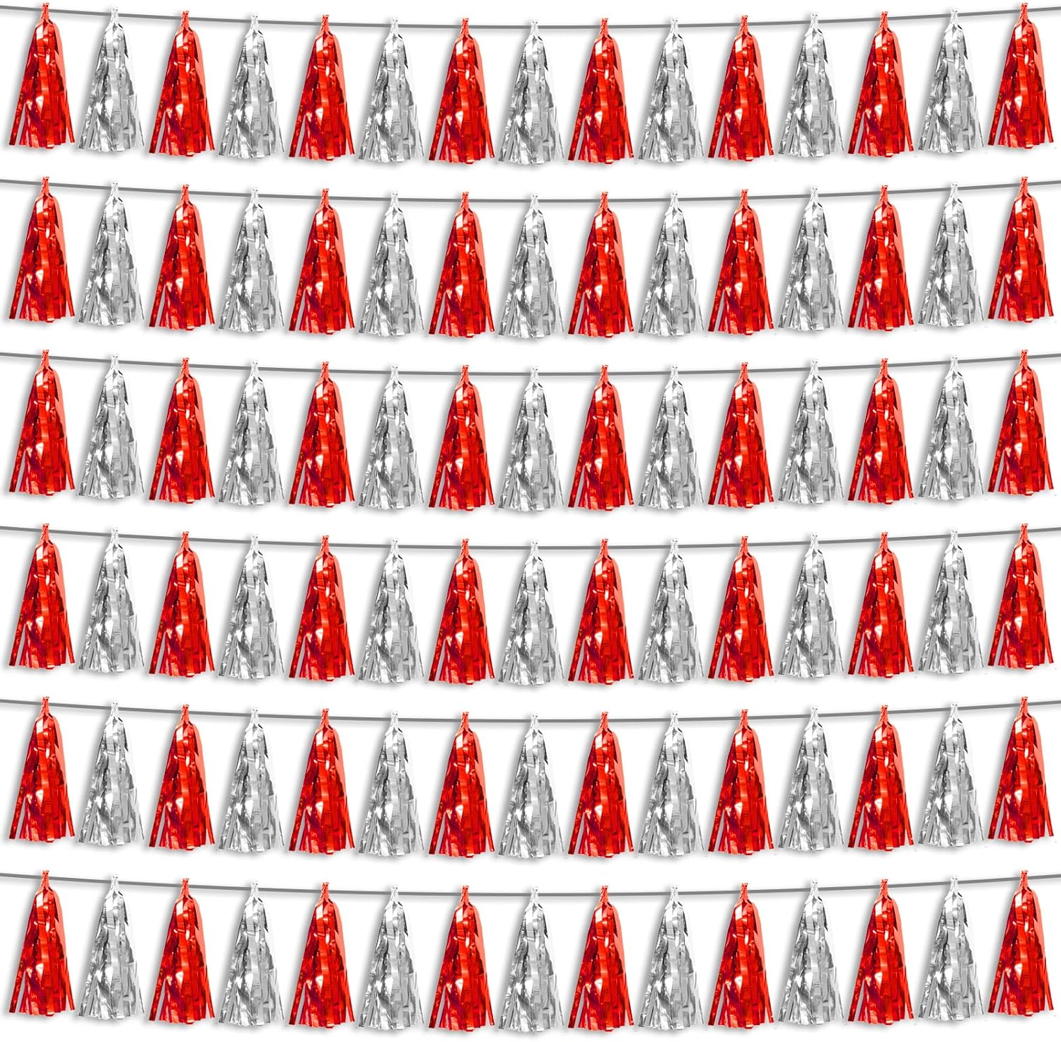 6P Red Silver Foil Fringe Metallic Tassel Streamers Banner Tassel Garland for Parade Floats, Bachelorette, Wedding, Birthday, Graduation, Christmas, Bridal/Baby Shower Party Decorations