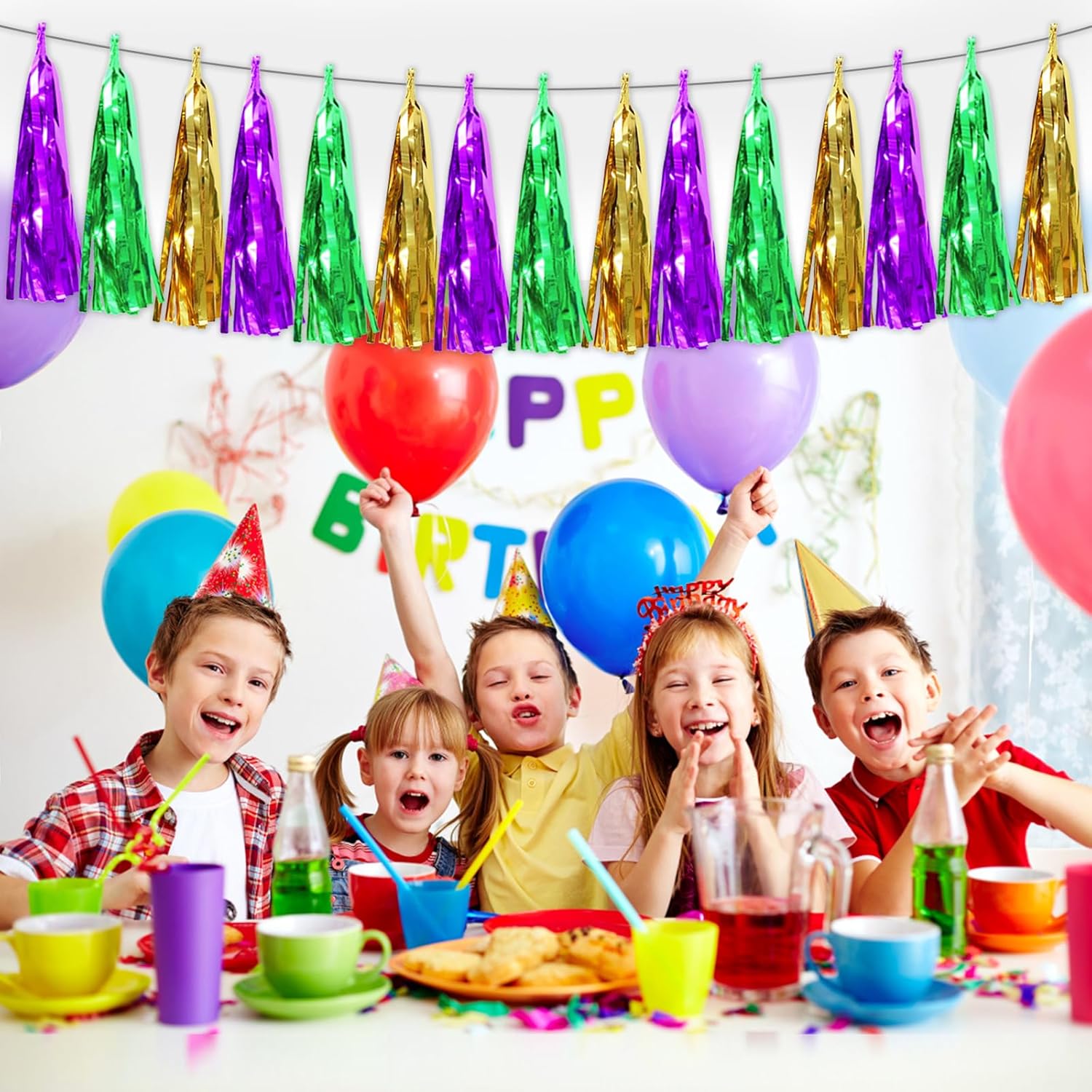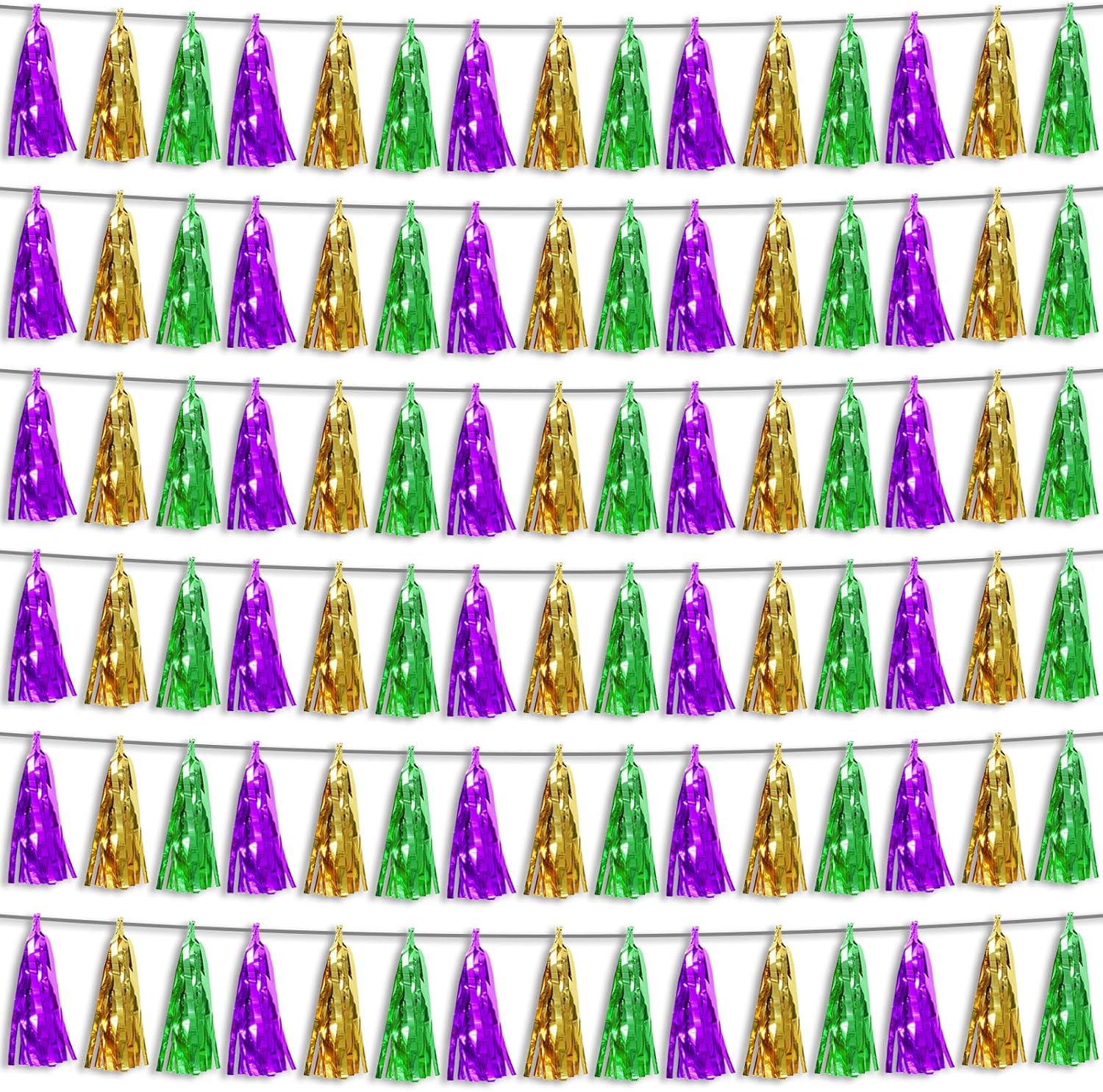 6P Purple Green Gold Foil Fringe Metallic Tassel Streamers Banner Tassel Garland for Parade Floats, Bachelorette, Wedding, Birthday, Graduation, Christmas, Bridal/Baby Shower Party Decorations