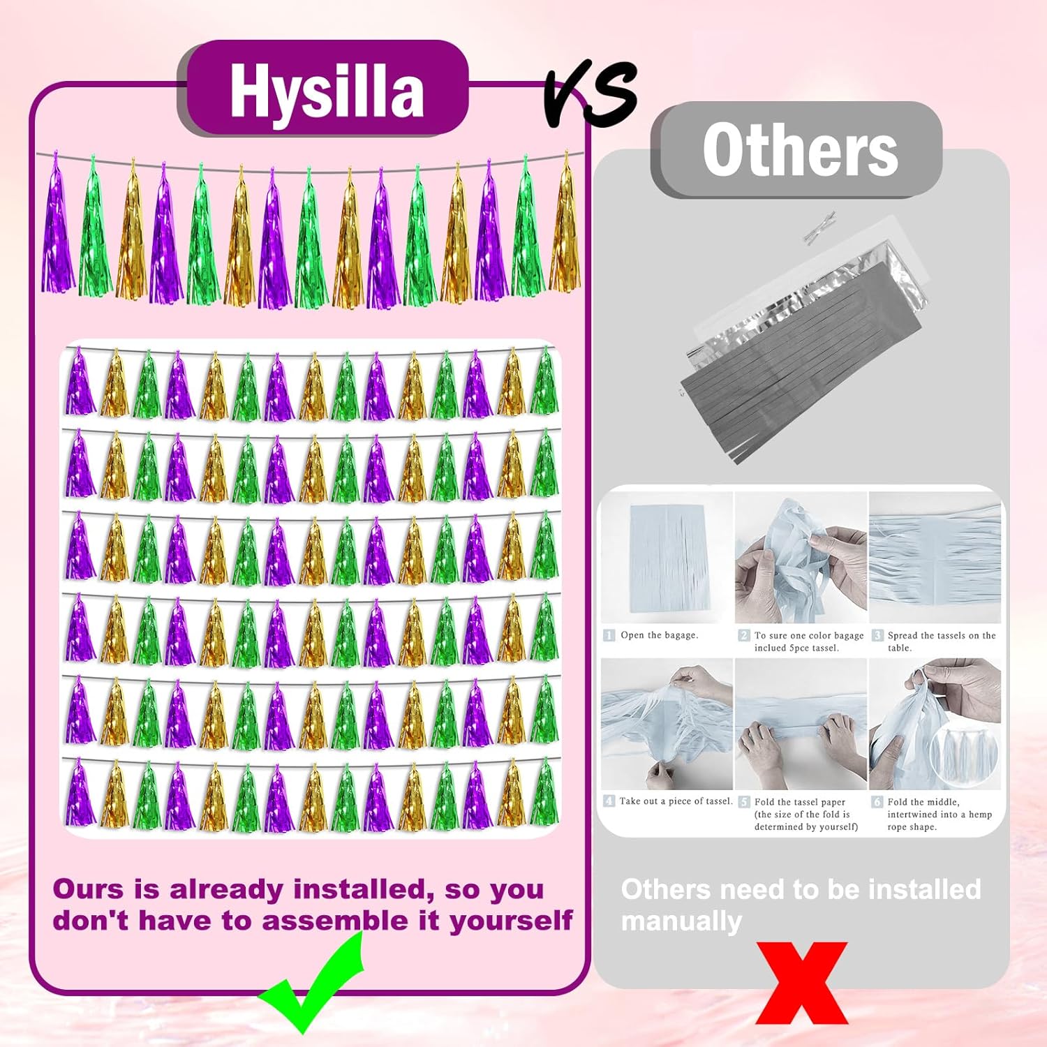 - 【Purple Green Gold Party Supplies Set】: The total length of the Purple Green Gold birthday tassels banner is 59 feet, divided into 6 strips, each 9.8 feet long. Each banner contains 15 tassels, and each tassel measures 14 inches, for birthday decorations many occasions, and so on