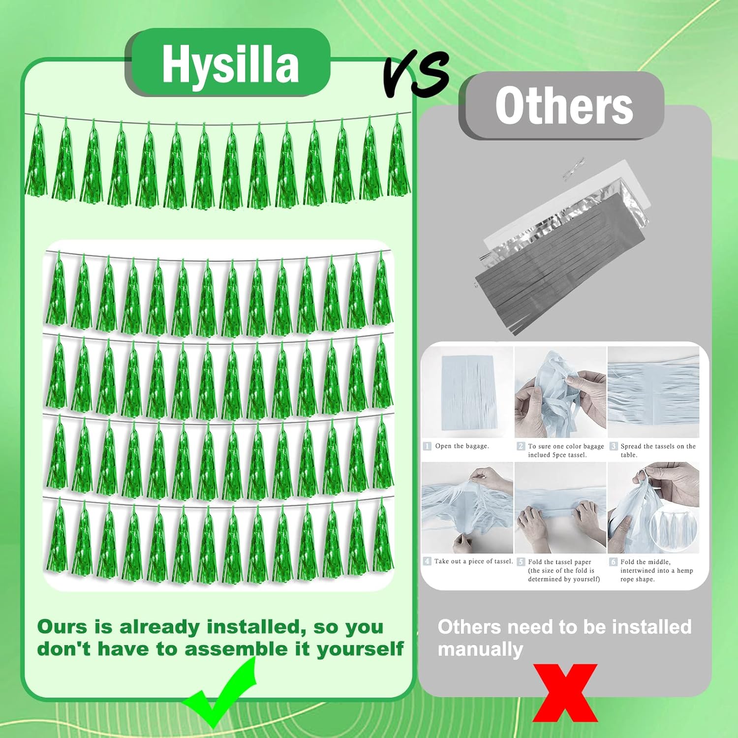 - 【Green Party Supplies Set】: The total length of the green birthday tassels banner is 59 feet, divided into 6 strips, each 9.8 feet long. Each banner contains 15 tassels, and each tassel measures 14 inches, for birthday decorations many occasions, and so on