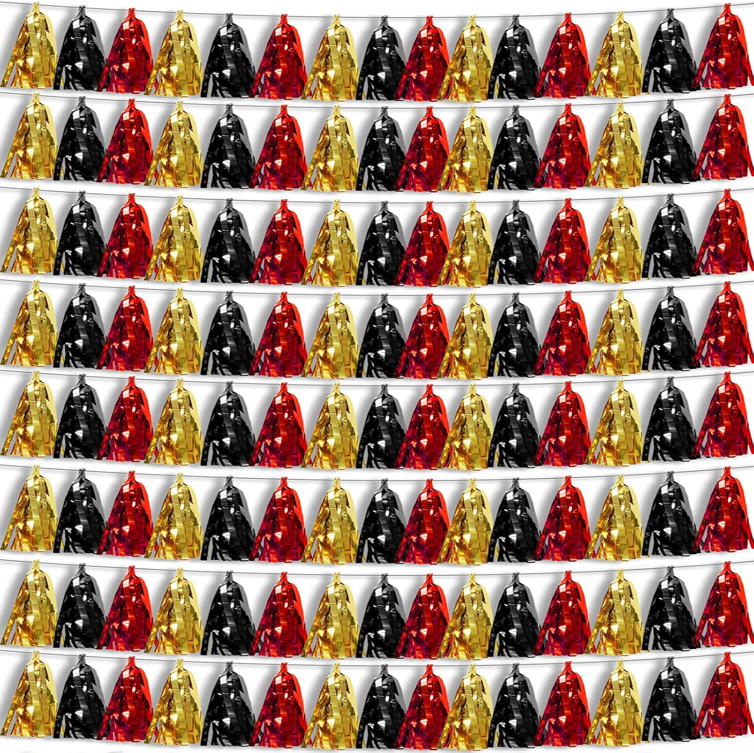 - 【Black Red Gold Party Supplies Set】: The total length of the black red gold birthday tassels banner is 78.7 feet 120tassels, divided into 8 strips, each 9.8 feet long. Each banner contains 15 tassels, and each tassel measures 14 inches, for birthday decorations many occasions, and so on