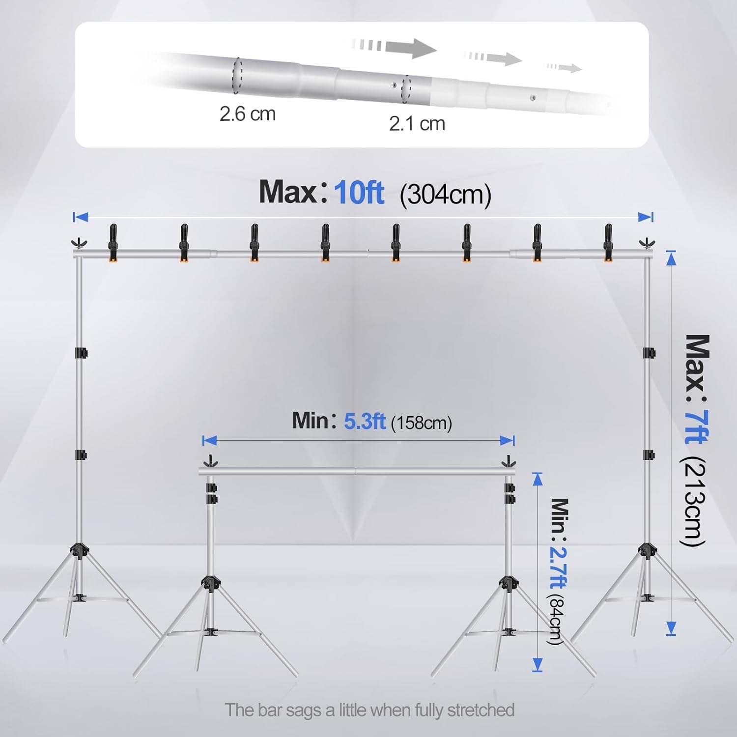- 【Sturdy Tripod Backdrop Stand】 With adjustable height (2.6ft/0.8m–7.0ft/2.1m) , the aluminum alloy backdrop stand is durable, and the design of the tripod base ensures it won’t shake when fully extended to its maximum size.