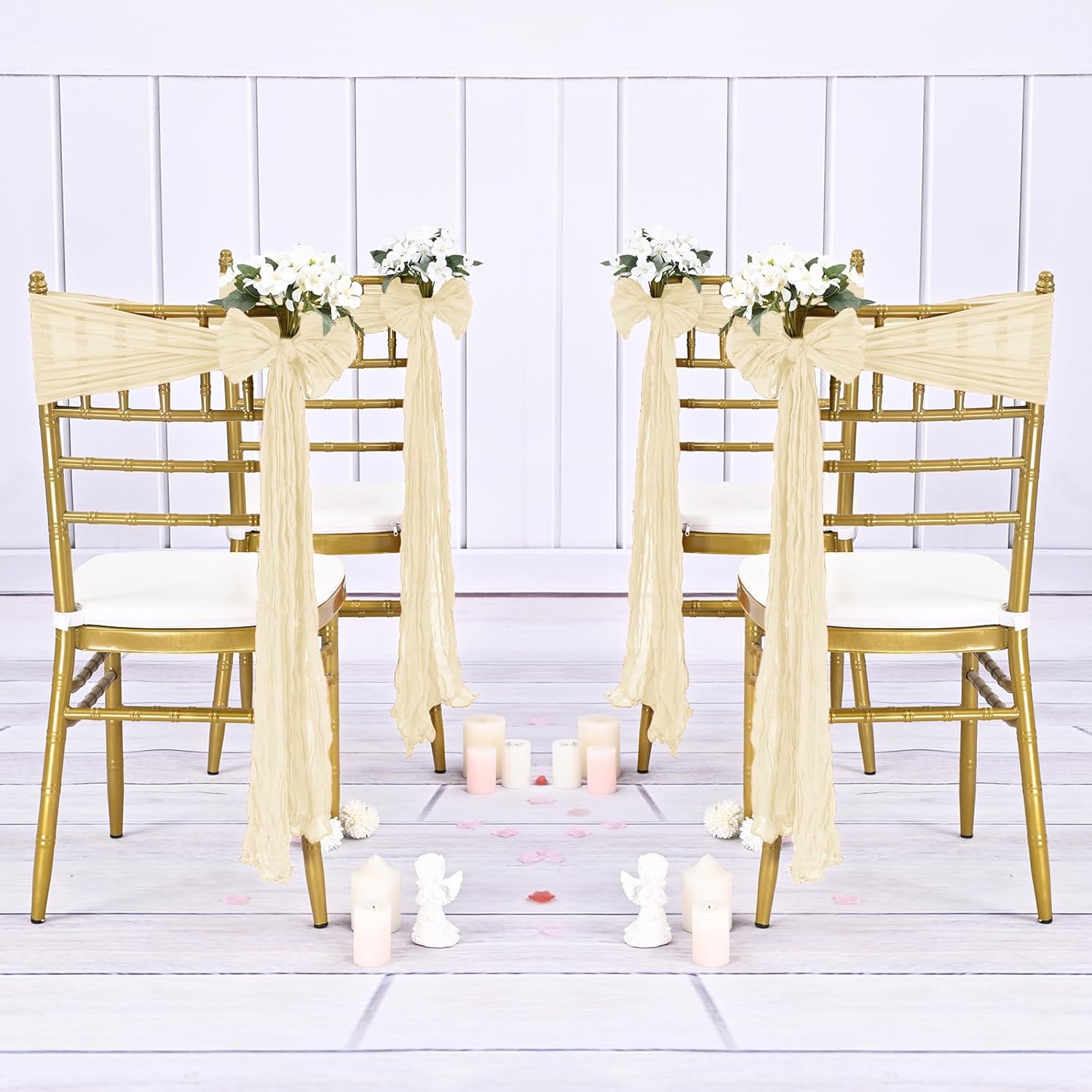 - 【Exquisite Craftsmanship】The cheesecloth chair sashes adopt unique handmade cheese cloth craftsmanship. The special wrinkle appearance design makes it more elegant, which can have a nice scene decoration effect and easily create an elegant and romantic atmosphere. The exquisite locking edges make it fixed in shape and not loose, which enhances the durability of the product and makes it easier to fix it on the chair without falling off.