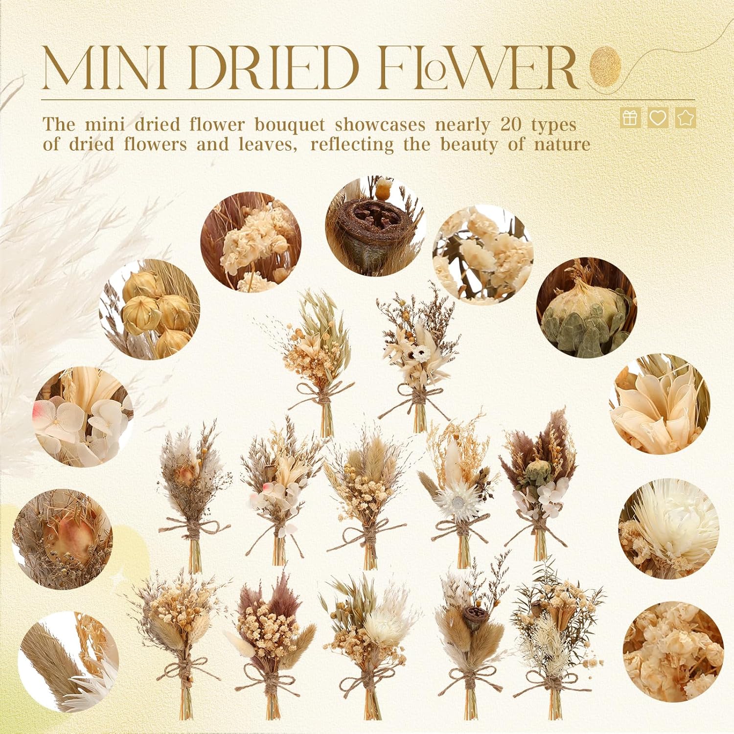 - Diverse Variety and Size: our mini dried flower bouquets showcase nearly 20 types of dried flowers and leaves; So the size of each bouquet cannot be guaranteed to be exactly the same;Each mini bouquet measures approximately 5-7 inches/ 12.70-17.78 cm, proper for small space decorations; Despite their light weight and small size, these bouquets embody the beauty of nature