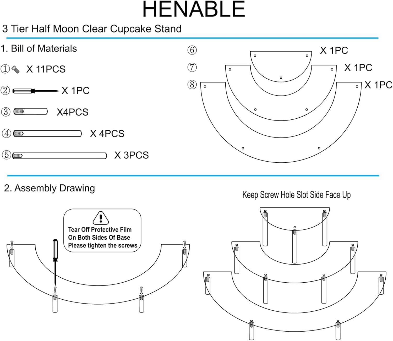 - What You Get: Acrylic half-moon dessert stand include 1 X 3-tier display stand, 1 X Phillips Screwdriver, 1 X Specification