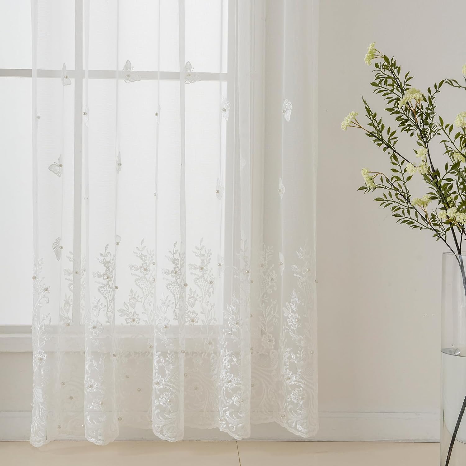 VISIONTEX White Sheer Voile Curtains, Decorative White Embossed Butterflies Rod Pocket Window Drapes for Home Kitchen, Living Room and Bedroom 54 x 95 Inch, Set of 2 Curtain Panels