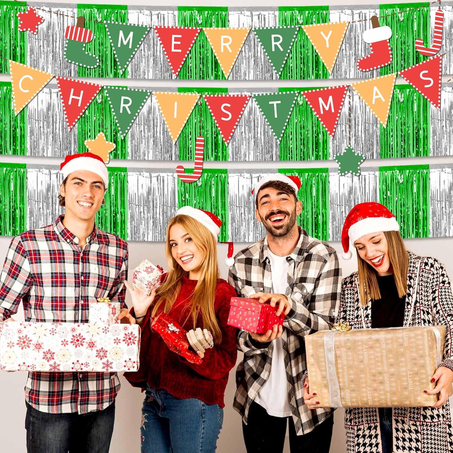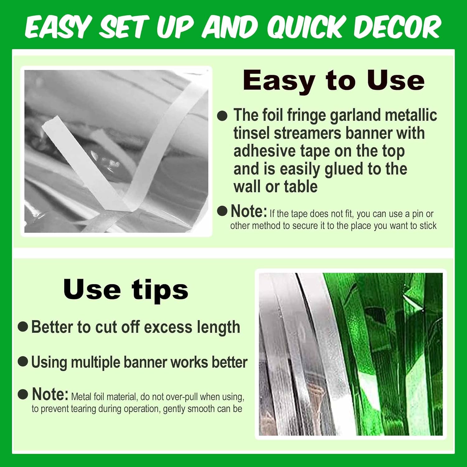 4 Pack 10 Ft Silver Green Foil Fringe Garland Metallic Streamers Tinsel Banner Wall Hanging Garland Backdrop for Parade Floats, Halloween, Christmas, Thanksgiving, New Year Party Decorations