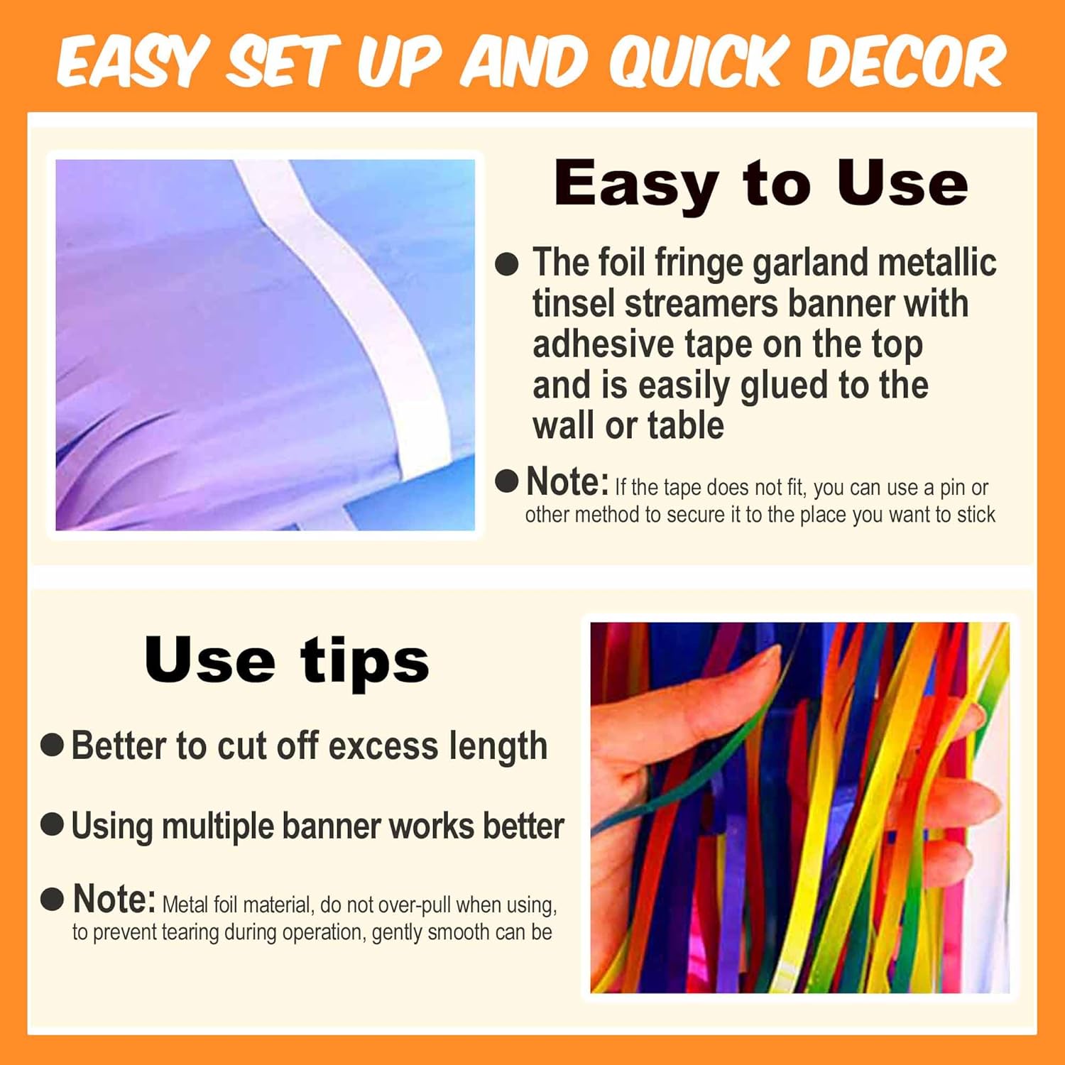 - Easy to Use: Tinsel foil fringe garland banner streamers the back has double-sided tape, gently peel double-sided tape off and it would be very easy to paste on wall, window, table, door, parade float or anywhere you want to decorate, add some festive atmosphere to the party