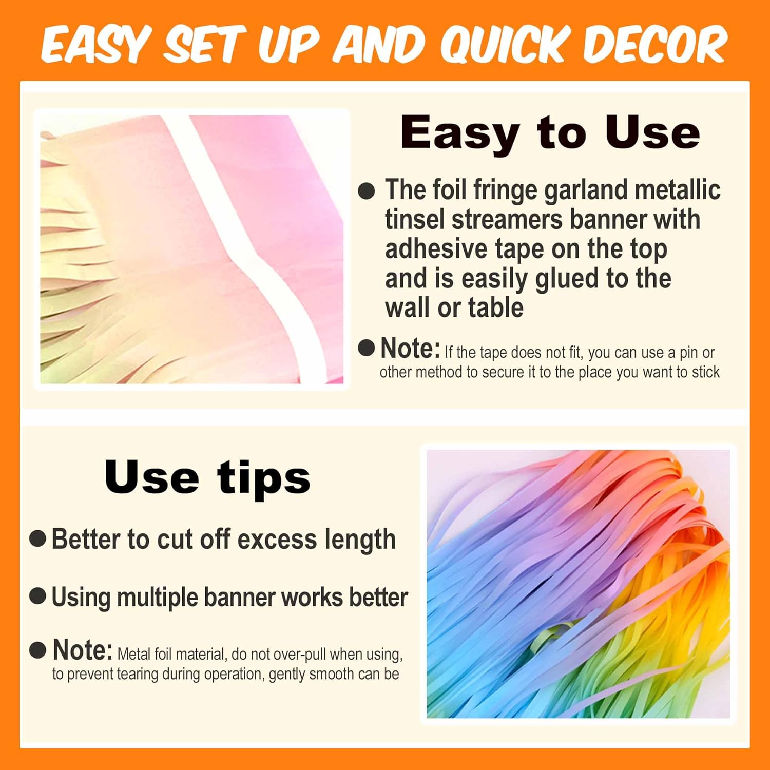 - Easy to Use: Tinsel foil fringe garland banner streamers the back has double-sided tape, gently peel double-sided tape off and it would be very easy to paste on wall, window, table, door, parade float or anywhere you want to decorate, add some festive atmosphere to the party