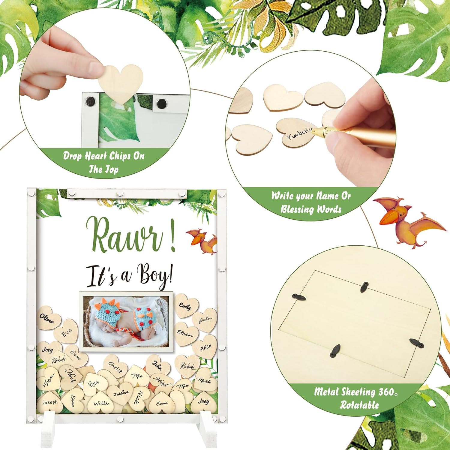 65 Pcs Dinosaur Baby Shower Guest Book Alternatives He or She Gender Reveal Baby Shower Decorations Sign in Guest Book with Picture Frame and 60 Wooden Chip