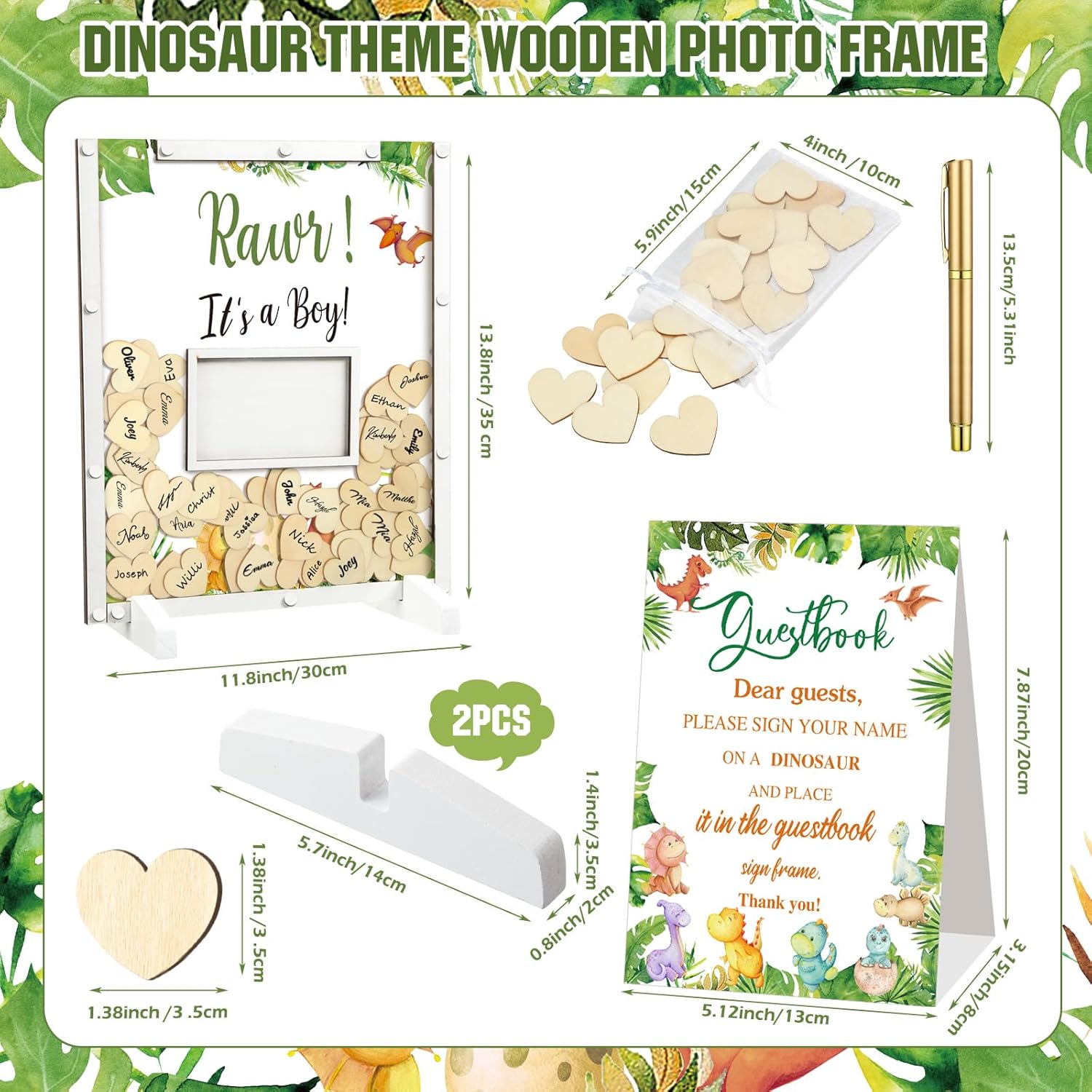 - Dinosaur Baby Shower Decorations: you will receive a dinosaur theme baby shower guest book with photo frame in 11.81 x 13.78 inches/ 30 x 35 cm, a pen, 60 dinosaur wood cutouts, 1 organza bag, 2 display shelves, enough to meet the needs of your dinosaur themed baby shower party