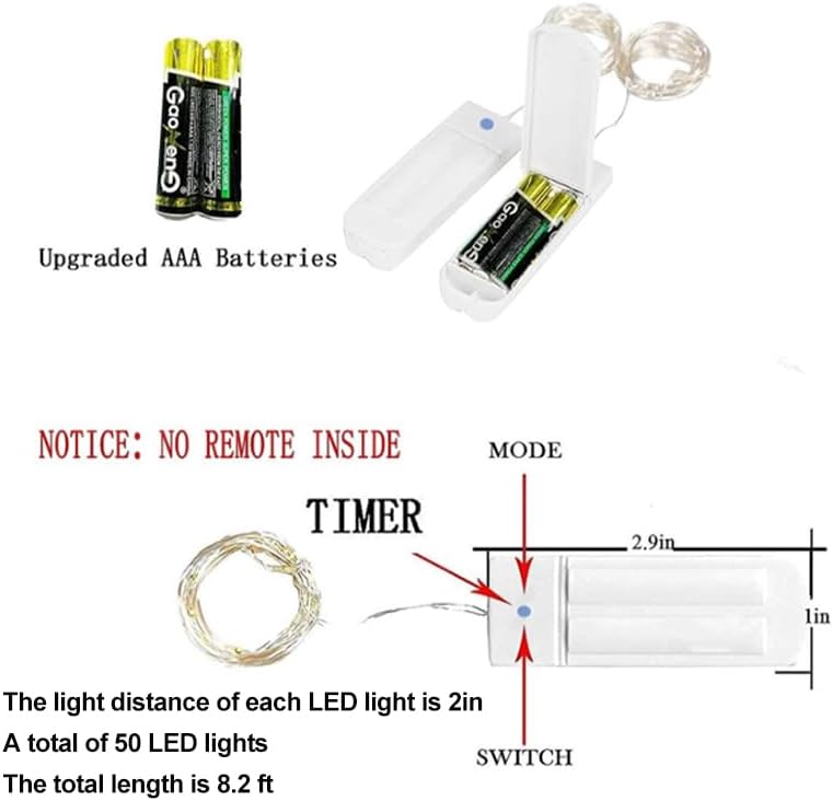 - 【4 Pack Ultra-Bright LED Battery Powered Fairy Lights】4 packs of 50LED lights with a total wire length of 8.2 feet. Each fairy lights is composed of 50 super bright LED bulbs, each bulb spacing of 2 inches, emit 2700k warm white light, bring a warm romantic atmosphere to your bedroom, garden, its battery box size of 2.95*0.9 inches;