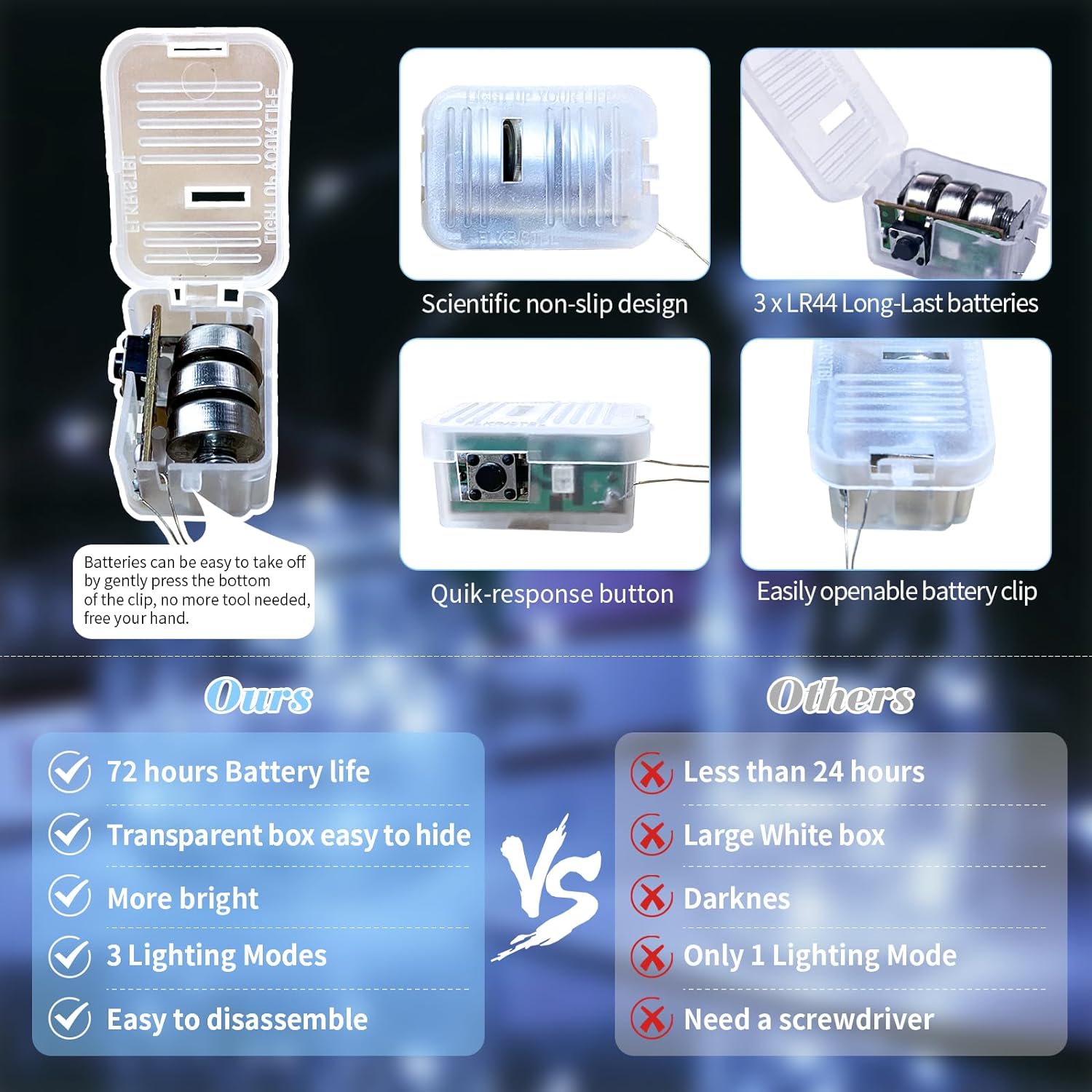 - PREMIUM QUALITY AND LONG LAST LIFE: 12 pack in a box, each twinkle lights made of high quality durable 7 feet long flexible silver wire, and 20 energy-efficient mini led fairy lights, 4 inch distance between each led moon lights. This fairy lights battery operated by 3 x LR44 batteries (included), which can provide 96 hours life. This Christmas lights is perfect for both everyday decorations as well as holiday decor (Batteries need to be replaced when the string get dims)