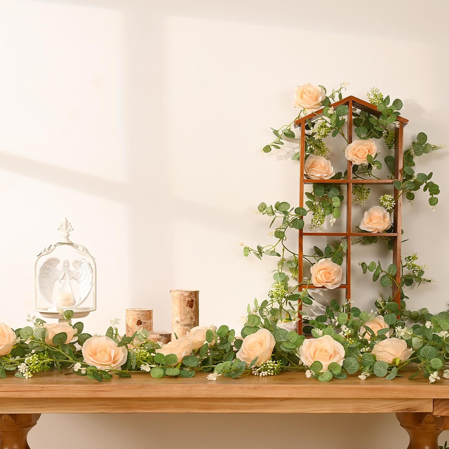 - 🌹PACKAGE INCLUDES: The package includes 4 Pcs artificial eucalyptus garland with flowers. Each piece of flower vine is 6.5Ft/2M long and decorated with 8 champagne roses, eucalyptus leaves and seeds. There are also many small plastic rings distributed on the vine for easy hanging. You can easily trim or bend the shape according to your own preferences and decorative needs.