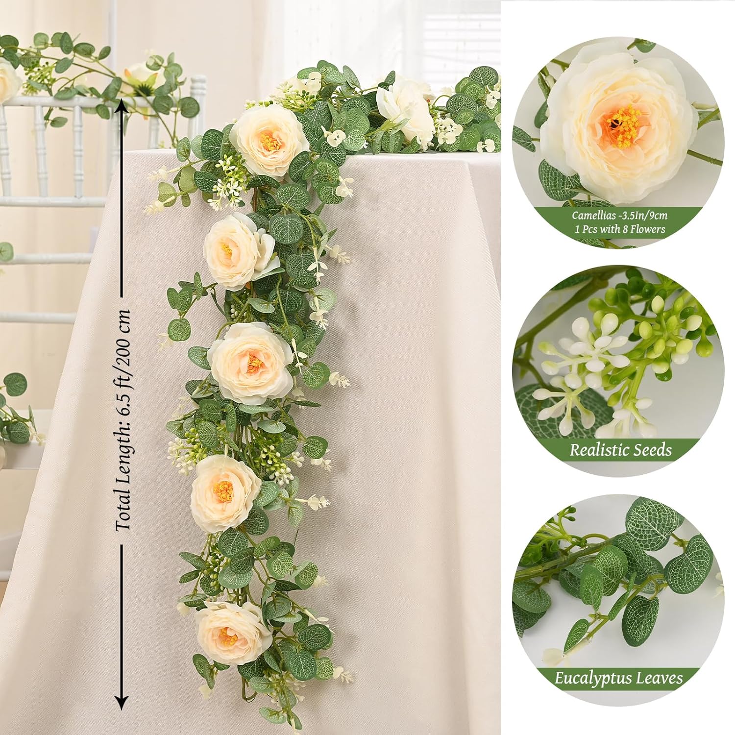 - 🌹PACKAGE INCLUDES: The package includes 4 Pcs artificial eucalyptus garland with flowers. Each piece of flower vine is 6.5Ft/2M long and decorated with 8 champagne camellias, eucalyptus leaves and seeds. There are also many small plastic rings distributed on the vine for easy hanging. You can easily trim or bend the shape according to your own preferences and decorative needs.