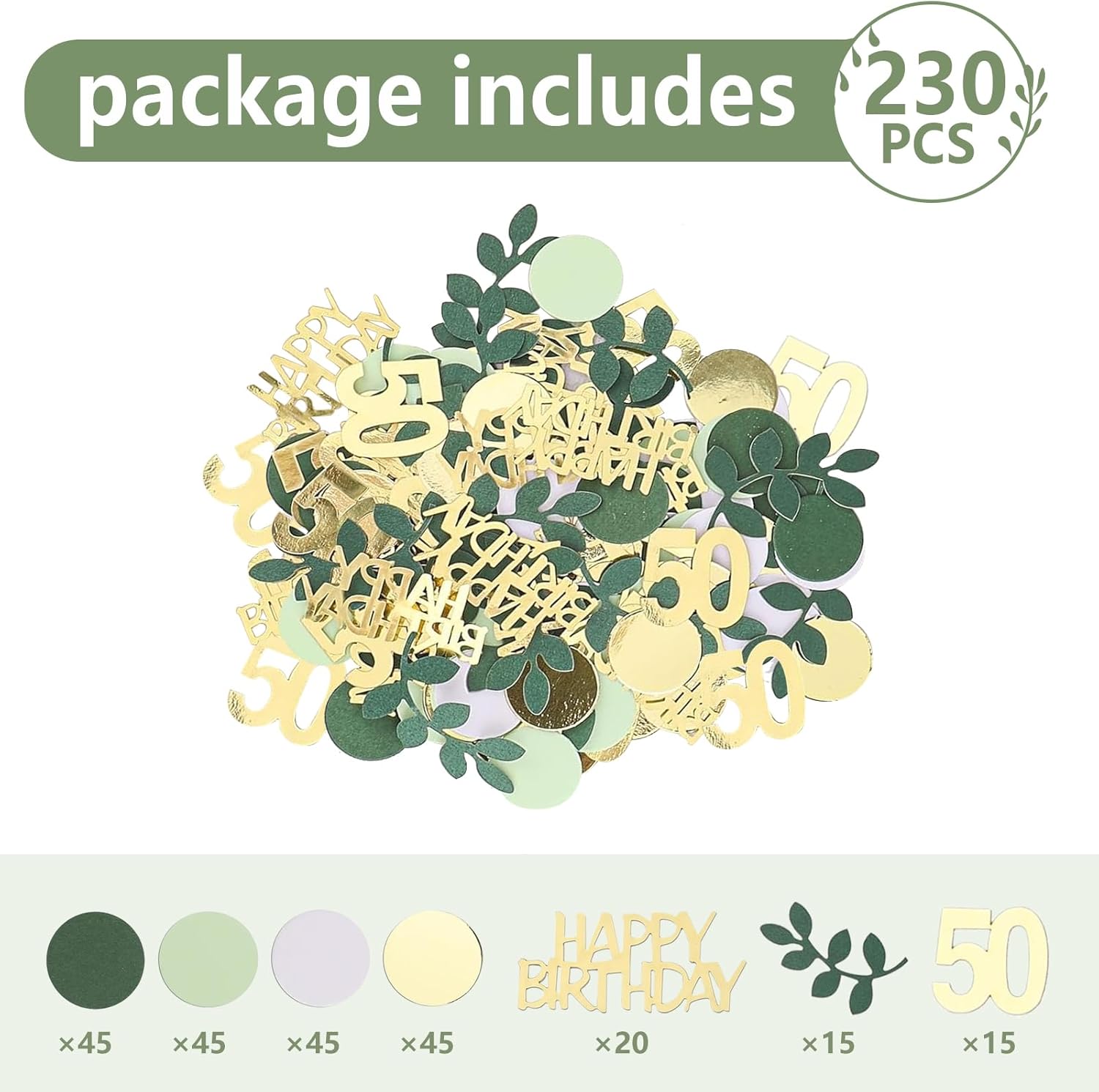 - 【YOU WILL GET】You will receive 50th Sage Green Gold Happy Birthday Confetti 230 pieces in 4 different colors (sage green, gold, white, dark green) green eucalyptus leaves and gold happy birthday, which can meet your various decoration needs.