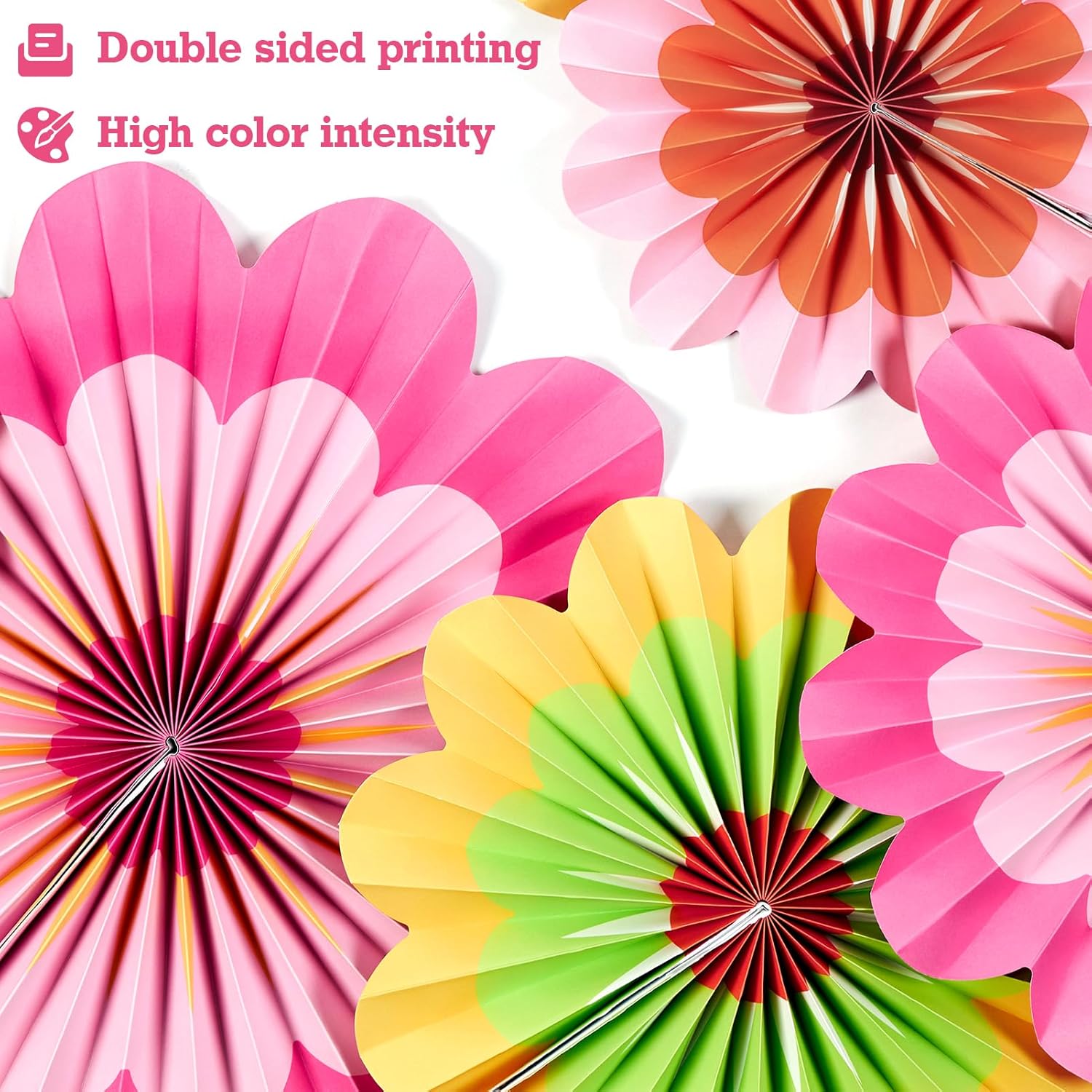 - 💐 Easy to Assemble and Reuse : you simply unfold each one and secure it with the self-sealing sticker on the back of the fan, or use the complimentary paperclip. Both of these work very well. If you use paper clips to hold the fans in place, it gives you the opportunity to reuse these fans at future parties.