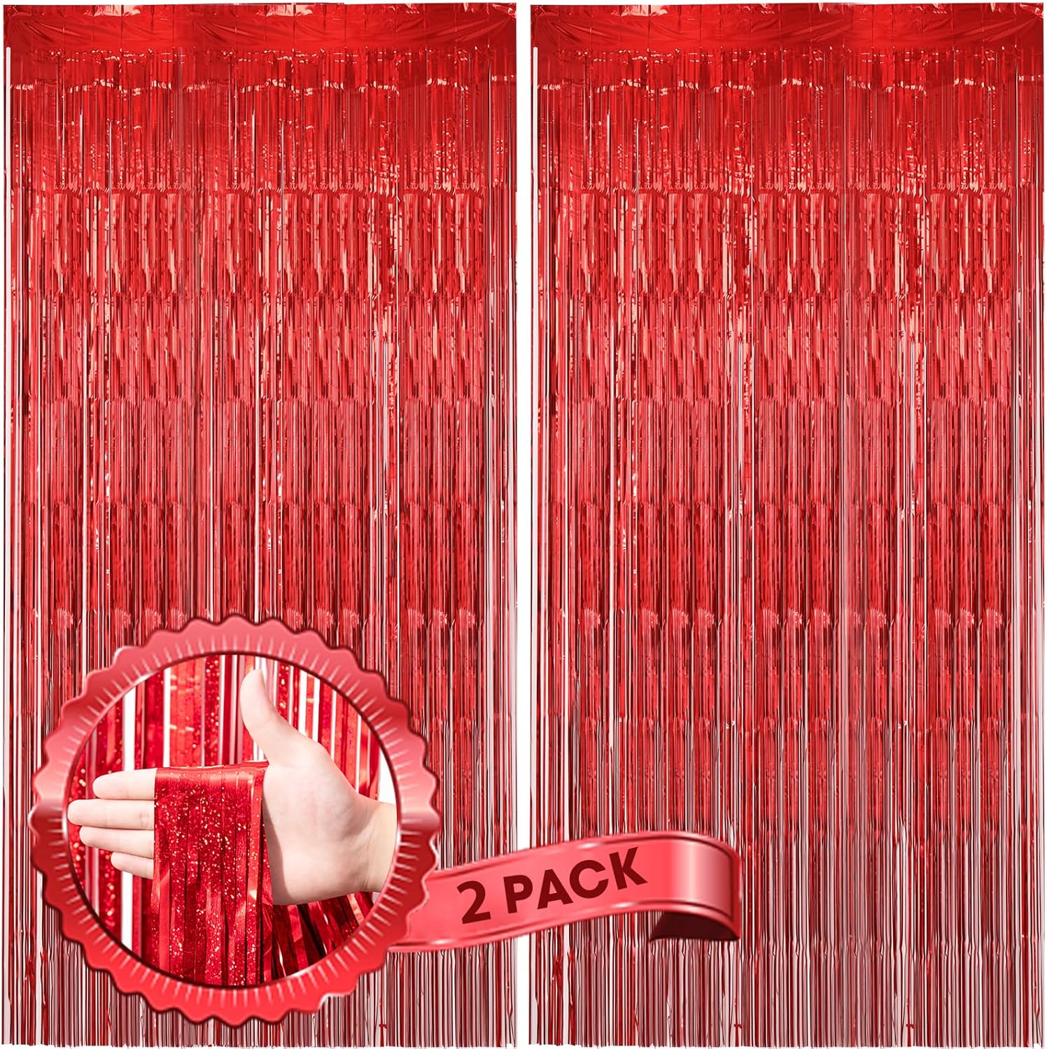 2 Pack Laser Red Foil Fringe Backdrop Curtains, Tinsel Streamers Birthday Party Decorations, Fringe Backdrop for Graduation, Baby Shower, Gender Reveal, Disco Party
