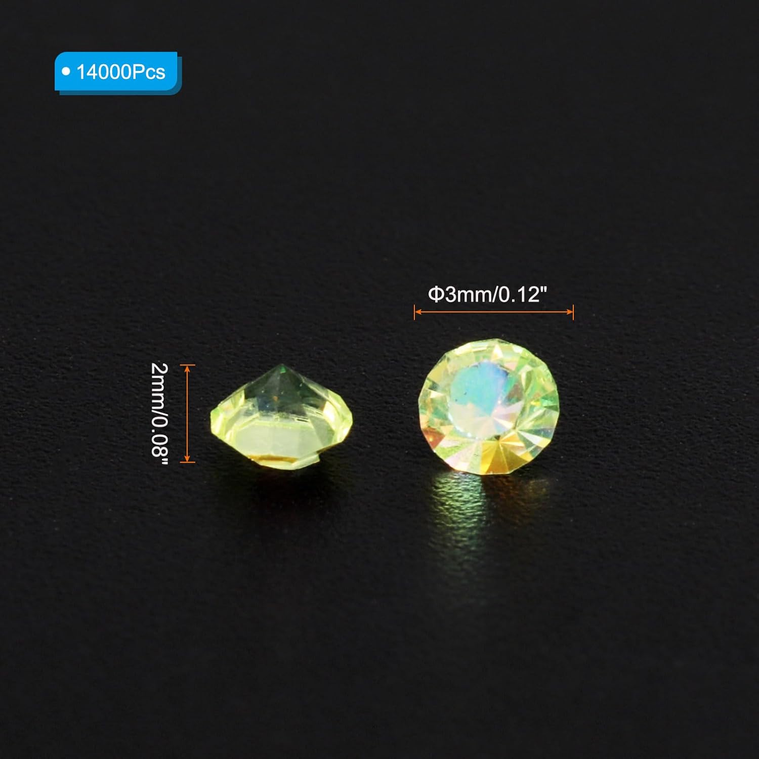 • Color: Chartreuse AB; Material: Acrylic; Size: 3mm x 2mm/ 0.12 x 0.08 inch (Dia.x H); Packing List: 14000Pcs x Acrylic crystal diamonds