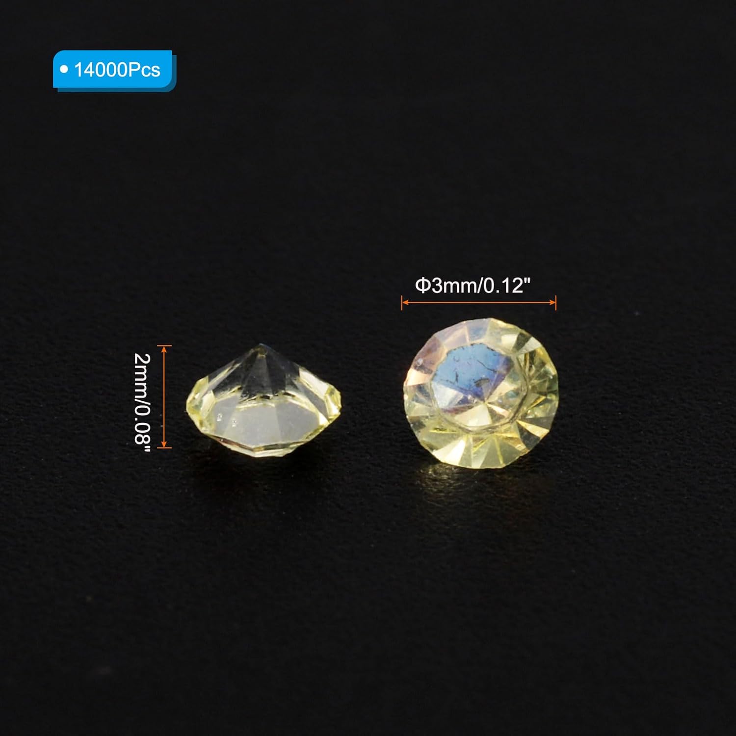 - Color: Light Yellow AB; Material: Acrylic; Size: 3mm x 2mm/ 0.12 x 0.08 inch (Dia.x H); Packing List: 14000Pcs x Acrylic crystal diamonds
