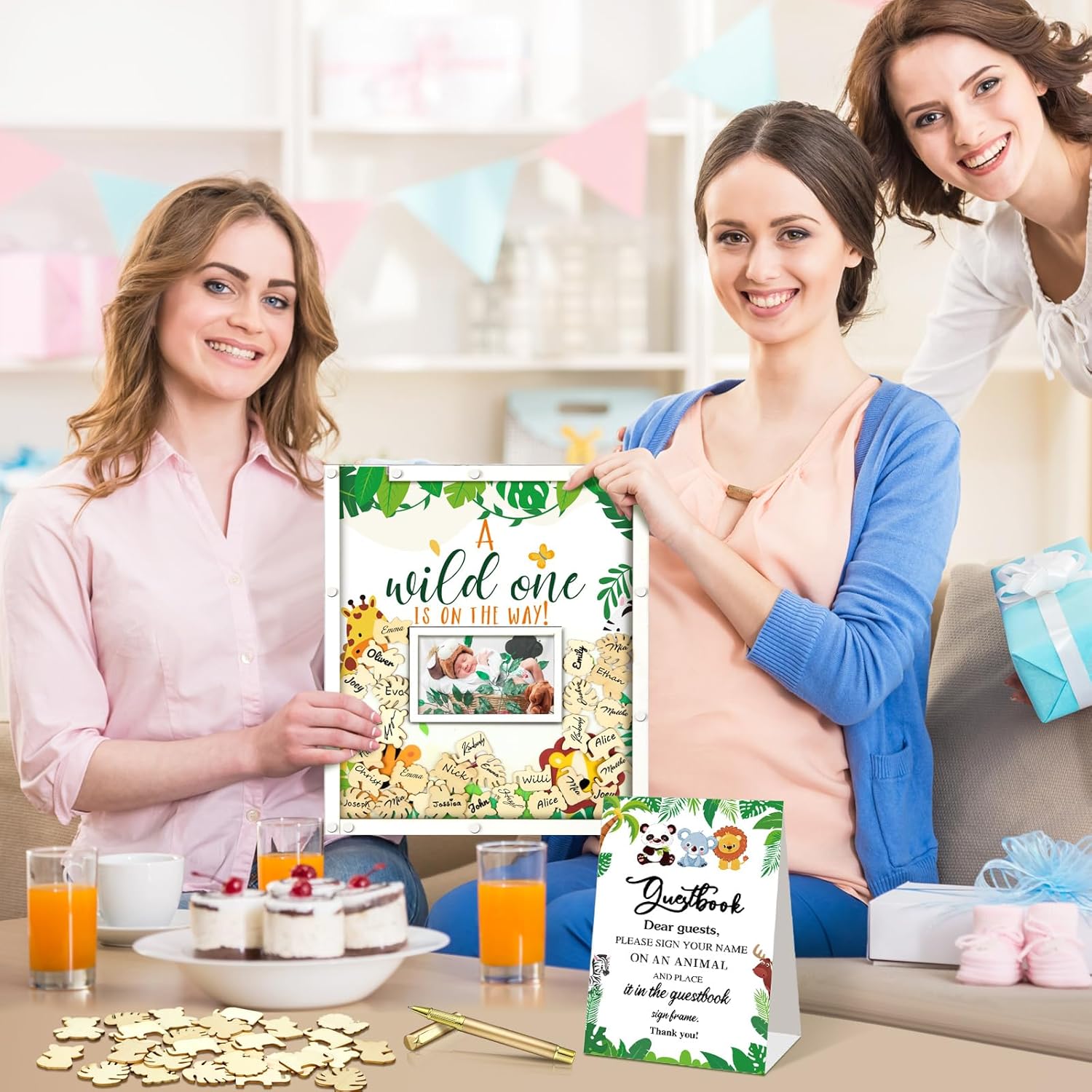 - Safari Animal Baby Shower Decorations: you will receive a wild one is on the way theme baby shower guest book with photo frame in 11.81 x 13.78 inches/ 30 x 35 cm, a pen, 60 safari animal wood cutouts, 1 organza bag, 2 display shelves, enough to meet the needs of your safari animal themed baby shower party